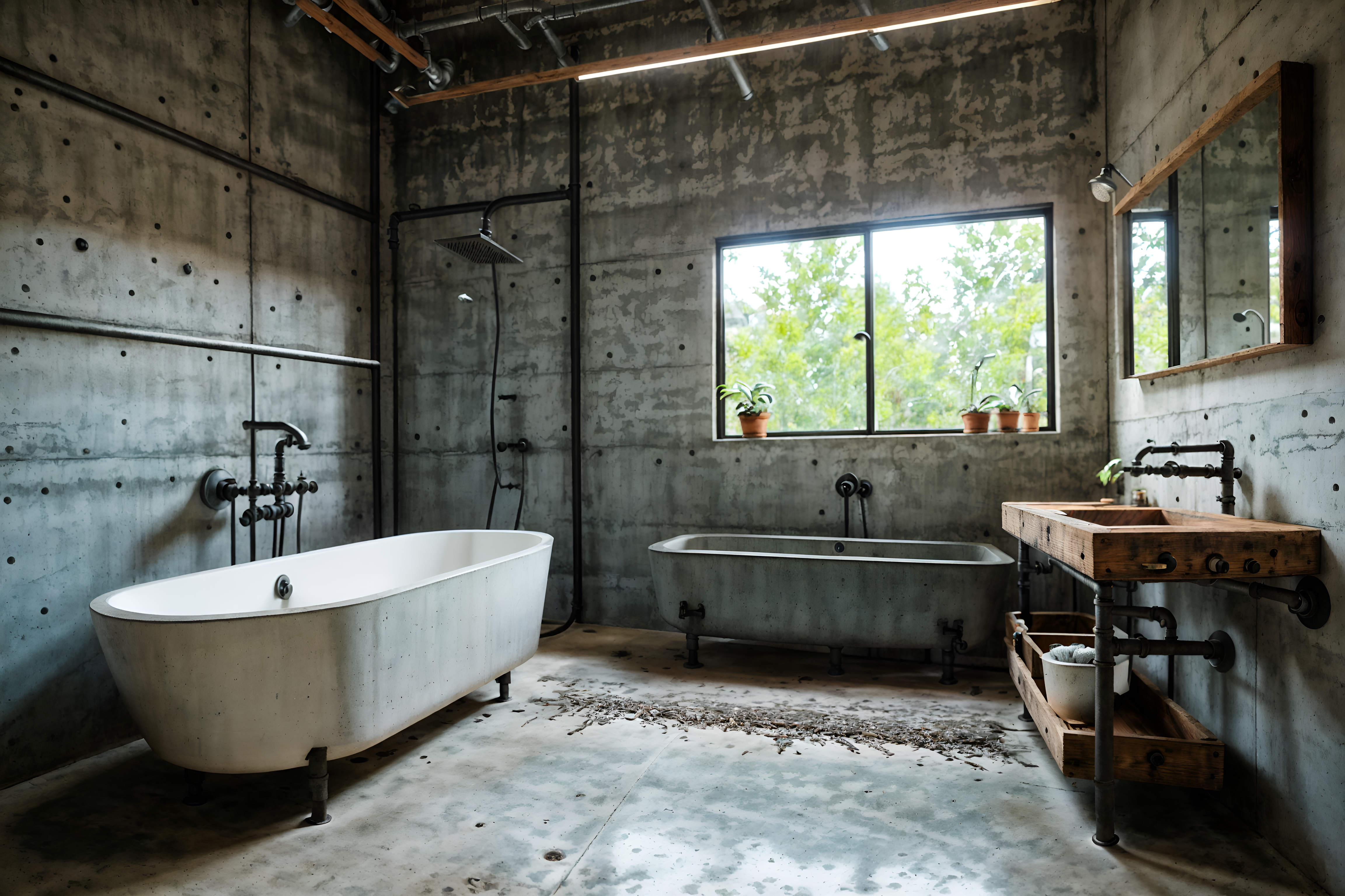 photo from pinterest of industrial-style interior designed (bathroom interior) with bathtub and waste basket and toilet seat and mirror and plant and bath rail and shower and bathroom sink with faucet. . with exposed concrete and exposed brick and exposed rafters and neutral tones and reclaimed wood and utilitarian objects and open floorplan and metal panels. . cinematic photo, highly detailed, cinematic lighting, ultra-detailed, ultrarealistic, photorealism, 8k. trending on pinterest. industrial interior design style. masterpiece, cinematic light, ultrarealistic+, photorealistic+, 8k, raw photo, realistic, sharp focus on eyes, (symmetrical eyes), (intact eyes), hyperrealistic, highest quality, best quality, , highly detailed, masterpiece, best quality, extremely detailed 8k wallpaper, masterpiece, best quality, ultra-detailed, best shadow, detailed background, detailed face, detailed eyes, high contrast, best illumination, detailed face, dulux, caustic, dynamic angle, detailed glow. dramatic lighting. highly detailed, insanely detailed hair, symmetrical, intricate details, professionally retouched, 8k high definition. strong bokeh. award winning photo.