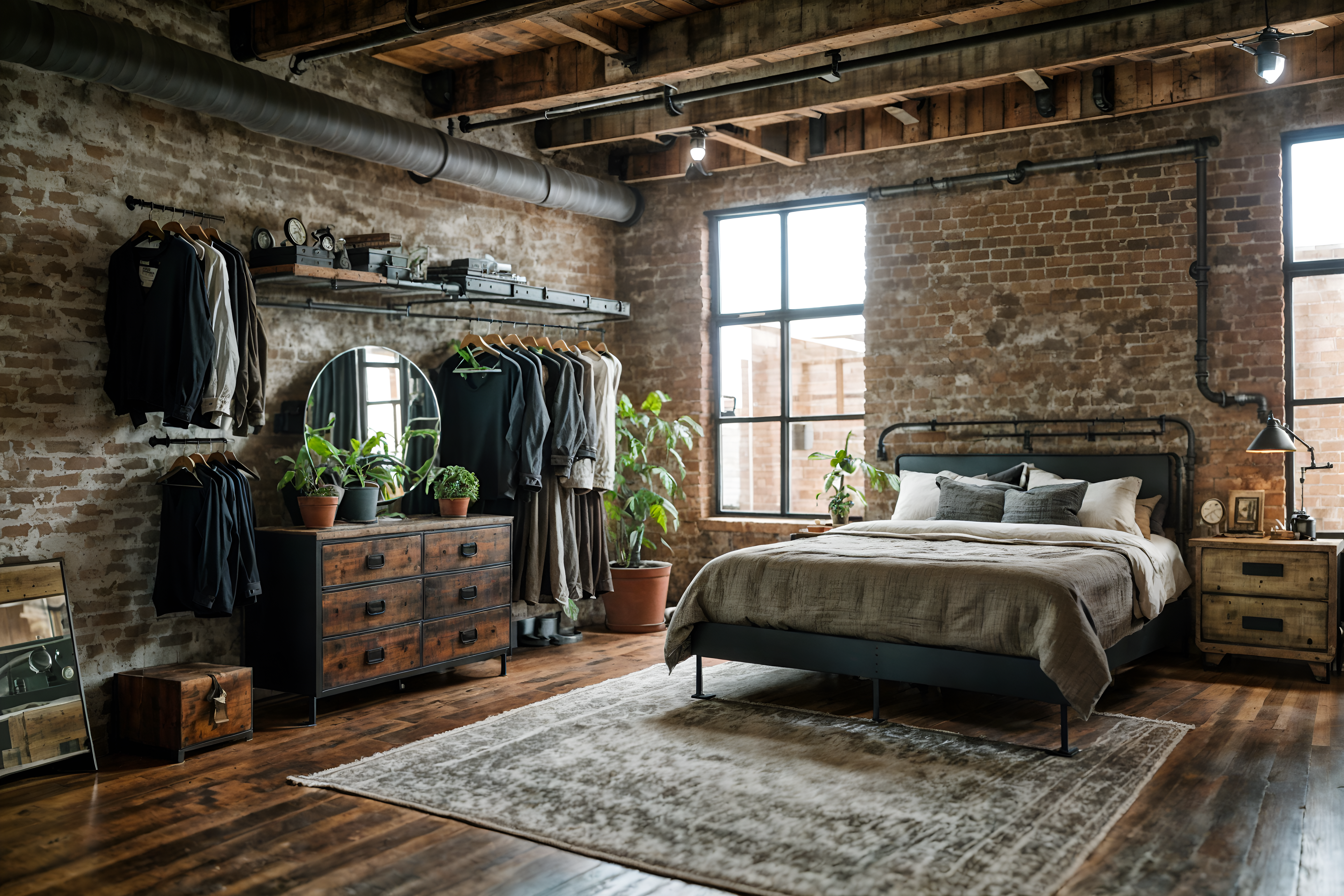 photo from pinterest of industrial-style interior designed (bedroom interior) with mirror and bed and dresser closet and headboard and accent chair and plant and bedside table or night stand and night light. . with exposed rafters and exposed brick and raw aesthetic and reclaimed wood and factory style and neutral tones and open floorplan and metal panels. . cinematic photo, highly detailed, cinematic lighting, ultra-detailed, ultrarealistic, photorealism, 8k. trending on pinterest. industrial interior design style. masterpiece, cinematic light, ultrarealistic+, photorealistic+, 8k, raw photo, realistic, sharp focus on eyes, (symmetrical eyes), (intact eyes), hyperrealistic, highest quality, best quality, , highly detailed, masterpiece, best quality, extremely detailed 8k wallpaper, masterpiece, best quality, ultra-detailed, best shadow, detailed background, detailed face, detailed eyes, high contrast, best illumination, detailed face, dulux, caustic, dynamic angle, detailed glow. dramatic lighting. highly detailed, insanely detailed hair, symmetrical, intricate details, professionally retouched, 8k high definition. strong bokeh. award winning photo.