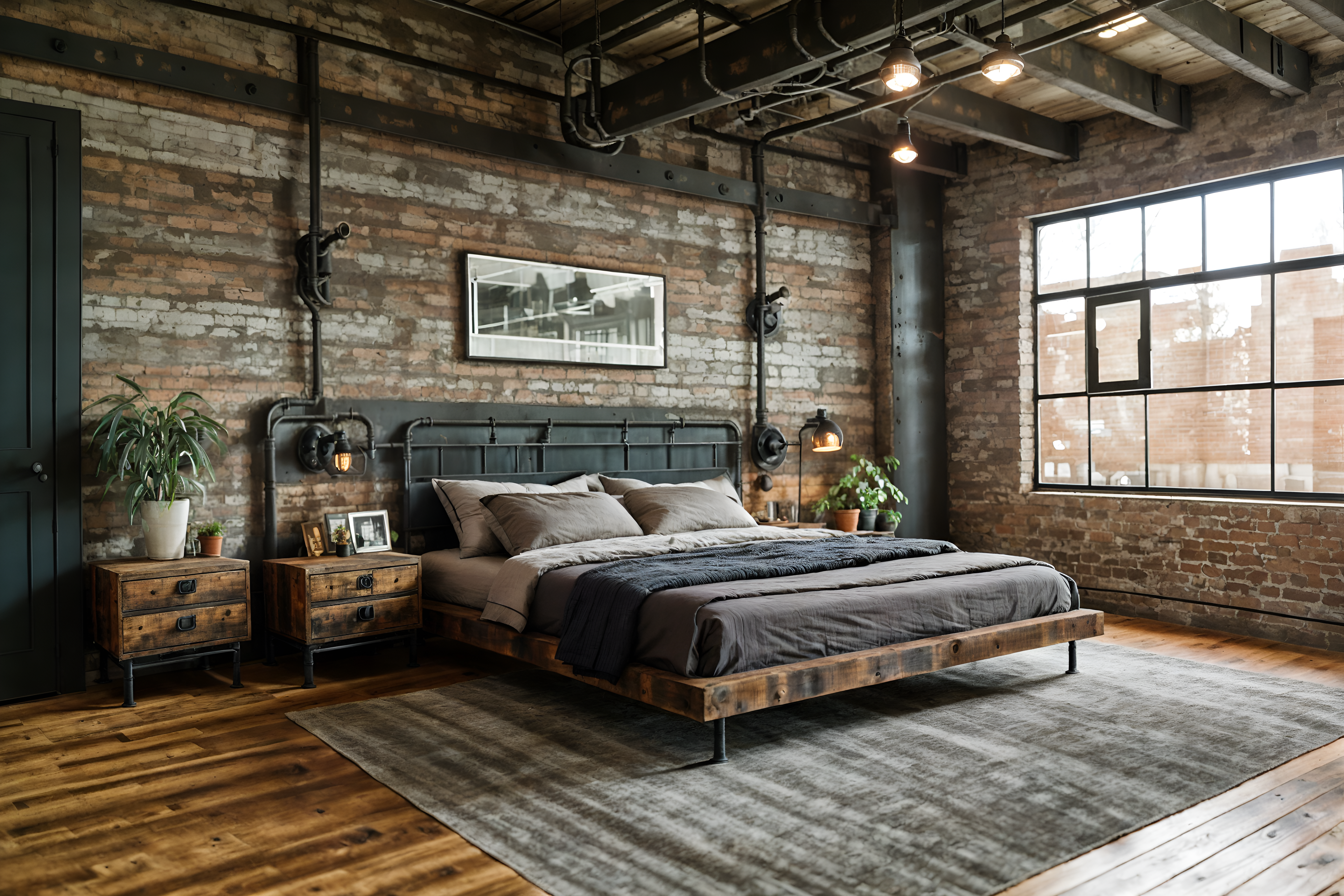 photo from pinterest of industrial-style interior designed (bedroom interior) with mirror and bed and dresser closet and headboard and accent chair and plant and bedside table or night stand and night light. . with exposed rafters and exposed brick and raw aesthetic and reclaimed wood and factory style and neutral tones and open floorplan and metal panels. . cinematic photo, highly detailed, cinematic lighting, ultra-detailed, ultrarealistic, photorealism, 8k. trending on pinterest. industrial interior design style. masterpiece, cinematic light, ultrarealistic+, photorealistic+, 8k, raw photo, realistic, sharp focus on eyes, (symmetrical eyes), (intact eyes), hyperrealistic, highest quality, best quality, , highly detailed, masterpiece, best quality, extremely detailed 8k wallpaper, masterpiece, best quality, ultra-detailed, best shadow, detailed background, detailed face, detailed eyes, high contrast, best illumination, detailed face, dulux, caustic, dynamic angle, detailed glow. dramatic lighting. highly detailed, insanely detailed hair, symmetrical, intricate details, professionally retouched, 8k high definition. strong bokeh. award winning photo.