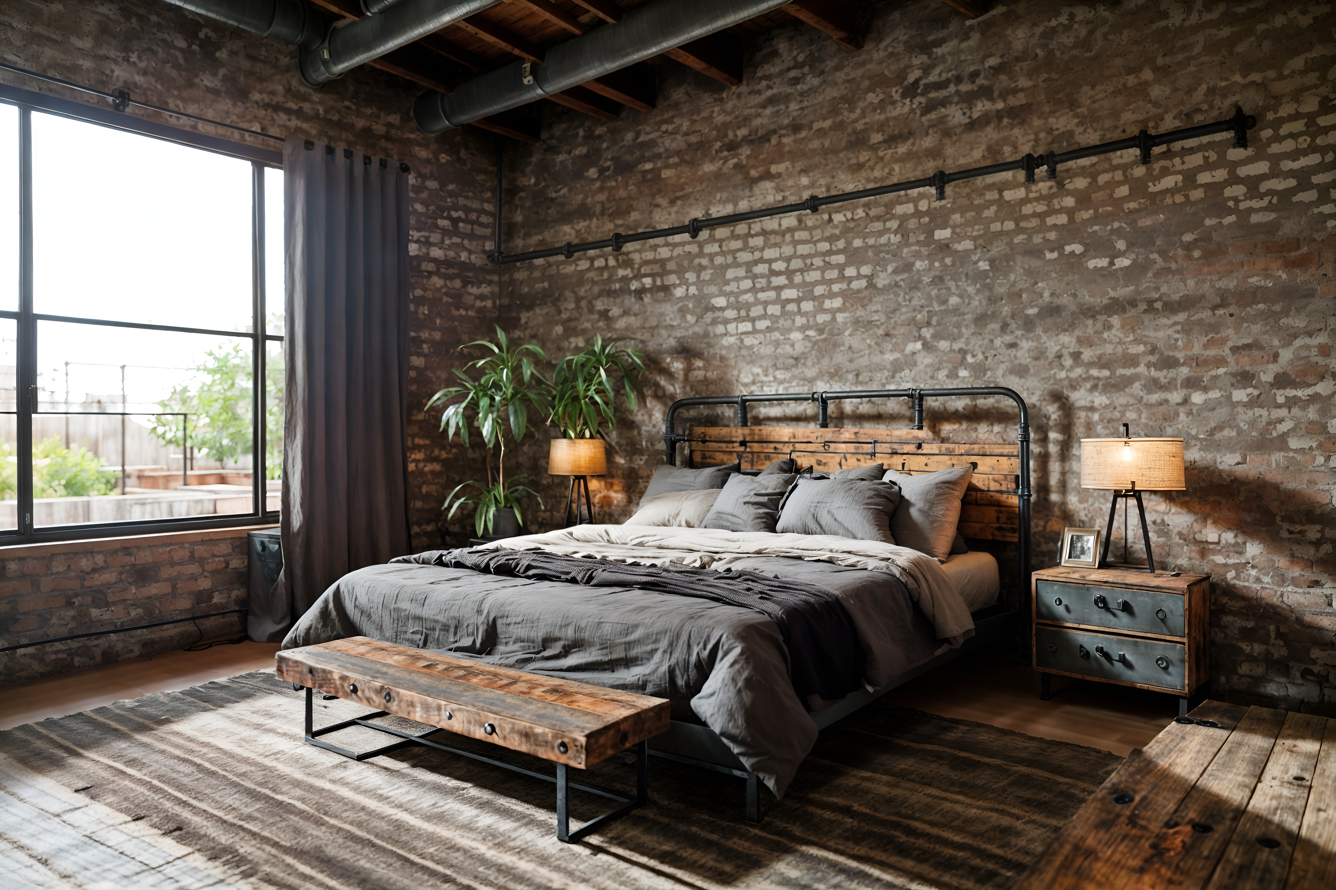 photo from pinterest of industrial-style interior designed (bedroom interior) with mirror and bed and dresser closet and headboard and accent chair and plant and bedside table or night stand and night light. . with exposed rafters and exposed brick and raw aesthetic and reclaimed wood and factory style and neutral tones and open floorplan and metal panels. . cinematic photo, highly detailed, cinematic lighting, ultra-detailed, ultrarealistic, photorealism, 8k. trending on pinterest. industrial interior design style. masterpiece, cinematic light, ultrarealistic+, photorealistic+, 8k, raw photo, realistic, sharp focus on eyes, (symmetrical eyes), (intact eyes), hyperrealistic, highest quality, best quality, , highly detailed, masterpiece, best quality, extremely detailed 8k wallpaper, masterpiece, best quality, ultra-detailed, best shadow, detailed background, detailed face, detailed eyes, high contrast, best illumination, detailed face, dulux, caustic, dynamic angle, detailed glow. dramatic lighting. highly detailed, insanely detailed hair, symmetrical, intricate details, professionally retouched, 8k high definition. strong bokeh. award winning photo.
