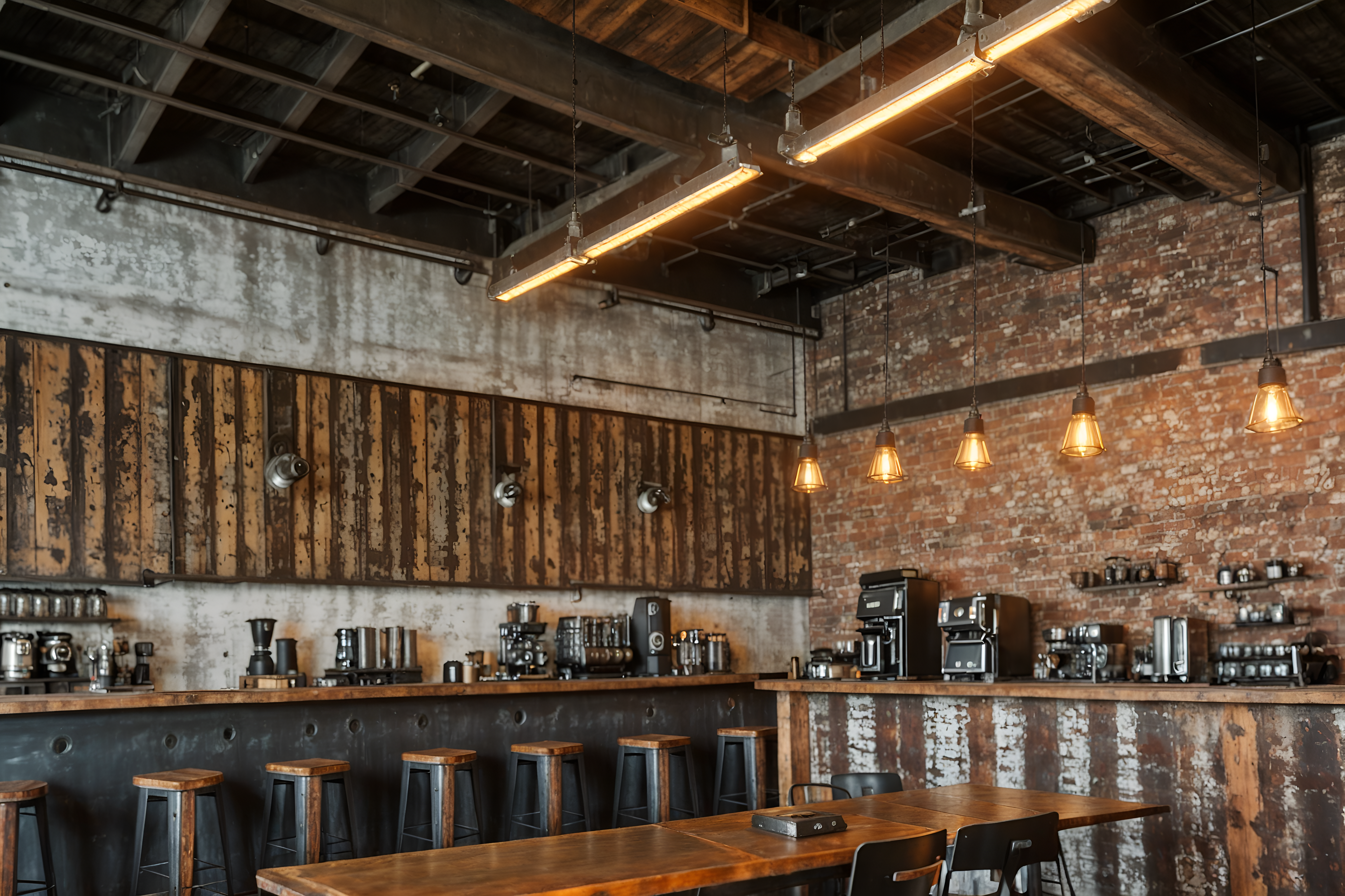 photo from pinterest of industrial-style interior designed (coffee shop interior) . with reclaimed wood and utilitarian objects and exposed brick and metal panels and neutral tones and factory style and exposed concrete and exposed rafters. . cinematic photo, highly detailed, cinematic lighting, ultra-detailed, ultrarealistic, photorealism, 8k. trending on pinterest. industrial interior design style. masterpiece, cinematic light, ultrarealistic+, photorealistic+, 8k, raw photo, realistic, sharp focus on eyes, (symmetrical eyes), (intact eyes), hyperrealistic, highest quality, best quality, , highly detailed, masterpiece, best quality, extremely detailed 8k wallpaper, masterpiece, best quality, ultra-detailed, best shadow, detailed background, detailed face, detailed eyes, high contrast, best illumination, detailed face, dulux, caustic, dynamic angle, detailed glow. dramatic lighting. highly detailed, insanely detailed hair, symmetrical, intricate details, professionally retouched, 8k high definition. strong bokeh. award winning photo.