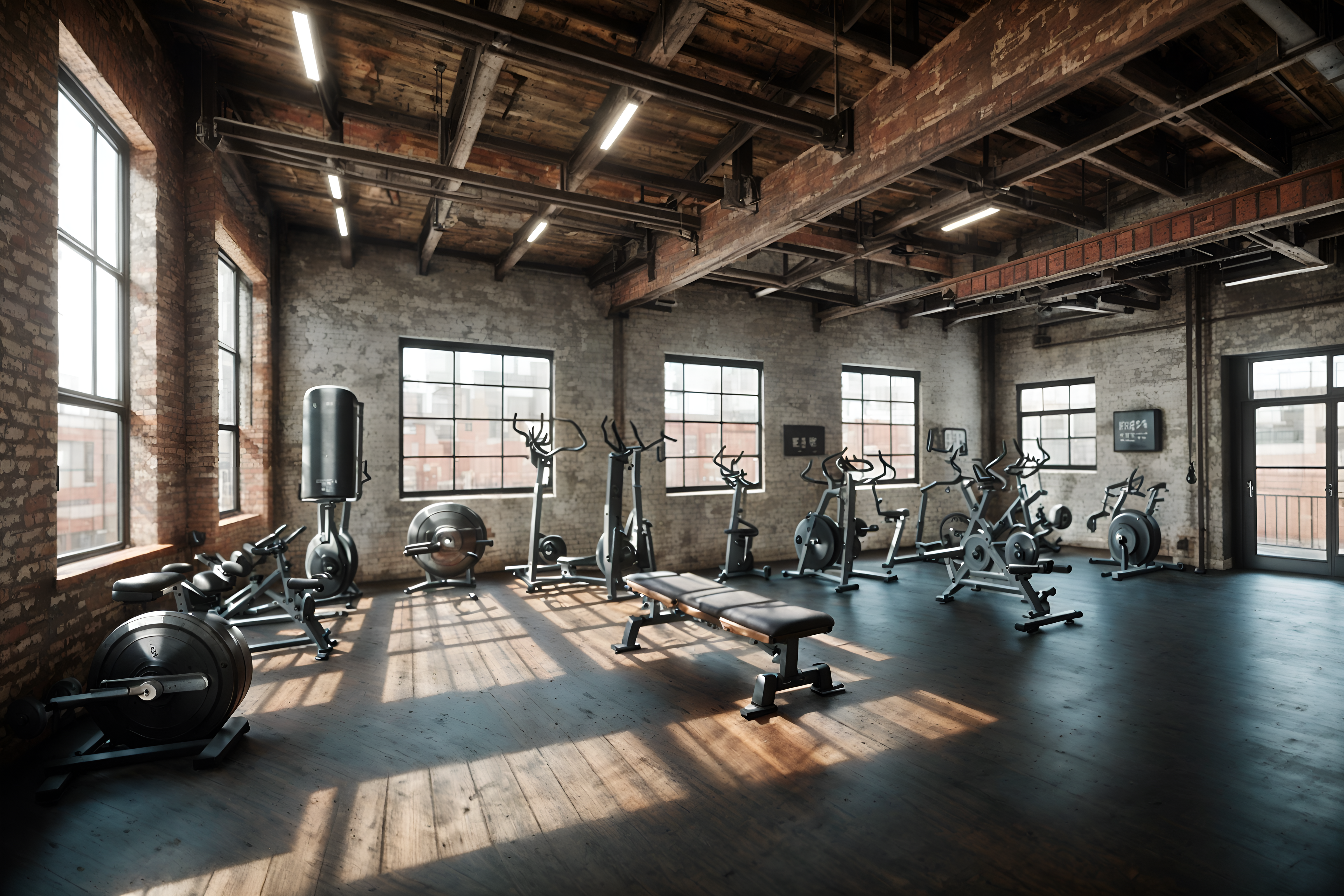 photo from pinterest of industrial-style interior designed (fitness gym interior) with exercise bicycle and dumbbell stand and squat rack and crosstrainer and bench press and exercise bicycle. . with exposed rafters and raw aesthetic and exposed brick and reclaimed wood and factory style and open floorplan and utilitarian objects and metal panels. . cinematic photo, highly detailed, cinematic lighting, ultra-detailed, ultrarealistic, photorealism, 8k. trending on pinterest. industrial interior design style. masterpiece, cinematic light, ultrarealistic+, photorealistic+, 8k, raw photo, realistic, sharp focus on eyes, (symmetrical eyes), (intact eyes), hyperrealistic, highest quality, best quality, , highly detailed, masterpiece, best quality, extremely detailed 8k wallpaper, masterpiece, best quality, ultra-detailed, best shadow, detailed background, detailed face, detailed eyes, high contrast, best illumination, detailed face, dulux, caustic, dynamic angle, detailed glow. dramatic lighting. highly detailed, insanely detailed hair, symmetrical, intricate details, professionally retouched, 8k high definition. strong bokeh. award winning photo.