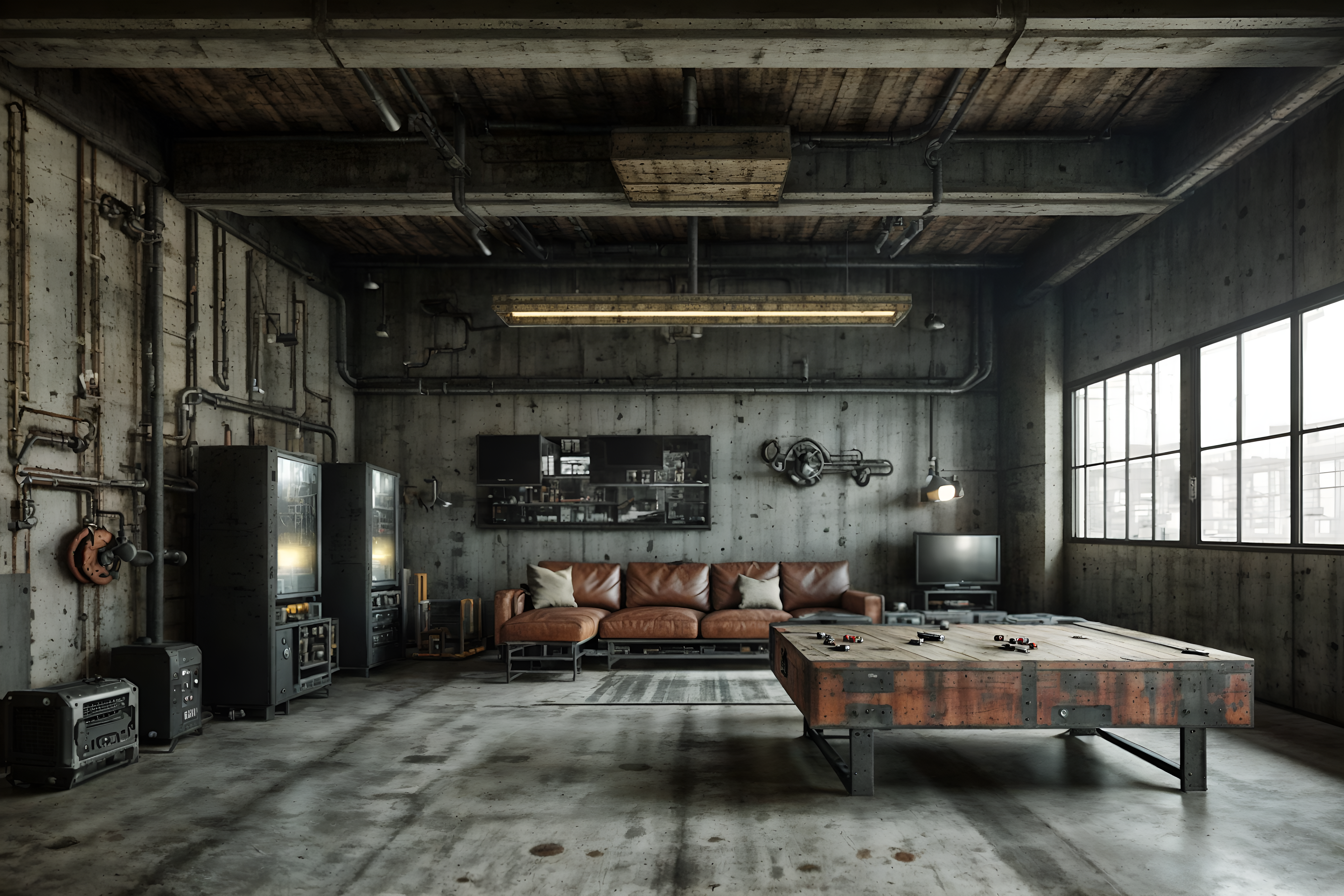 photo from pinterest of industrial-style interior designed (gaming room interior) . with reclaimed wood and neutral tones and open floorplan and raw aesthetic and metal panels and exposed concrete and utilitarian objects and exposed rafters. . cinematic photo, highly detailed, cinematic lighting, ultra-detailed, ultrarealistic, photorealism, 8k. trending on pinterest. industrial interior design style. masterpiece, cinematic light, ultrarealistic+, photorealistic+, 8k, raw photo, realistic, sharp focus on eyes, (symmetrical eyes), (intact eyes), hyperrealistic, highest quality, best quality, , highly detailed, masterpiece, best quality, extremely detailed 8k wallpaper, masterpiece, best quality, ultra-detailed, best shadow, detailed background, detailed face, detailed eyes, high contrast, best illumination, detailed face, dulux, caustic, dynamic angle, detailed glow. dramatic lighting. highly detailed, insanely detailed hair, symmetrical, intricate details, professionally retouched, 8k high definition. strong bokeh. award winning photo.