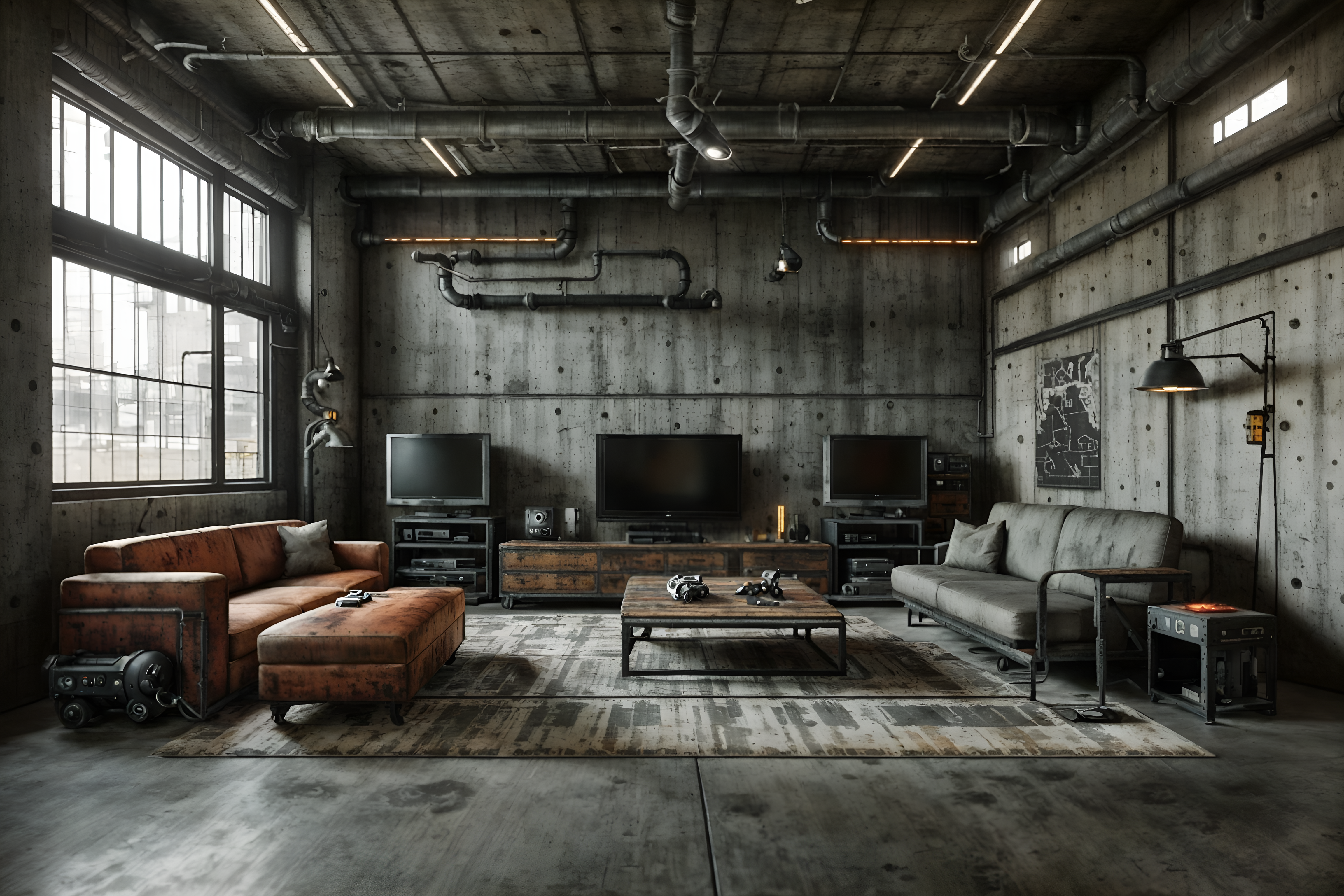 photo from pinterest of industrial-style interior designed (gaming room interior) . with reclaimed wood and neutral tones and open floorplan and raw aesthetic and metal panels and exposed concrete and utilitarian objects and exposed rafters. . cinematic photo, highly detailed, cinematic lighting, ultra-detailed, ultrarealistic, photorealism, 8k. trending on pinterest. industrial interior design style. masterpiece, cinematic light, ultrarealistic+, photorealistic+, 8k, raw photo, realistic, sharp focus on eyes, (symmetrical eyes), (intact eyes), hyperrealistic, highest quality, best quality, , highly detailed, masterpiece, best quality, extremely detailed 8k wallpaper, masterpiece, best quality, ultra-detailed, best shadow, detailed background, detailed face, detailed eyes, high contrast, best illumination, detailed face, dulux, caustic, dynamic angle, detailed glow. dramatic lighting. highly detailed, insanely detailed hair, symmetrical, intricate details, professionally retouched, 8k high definition. strong bokeh. award winning photo.