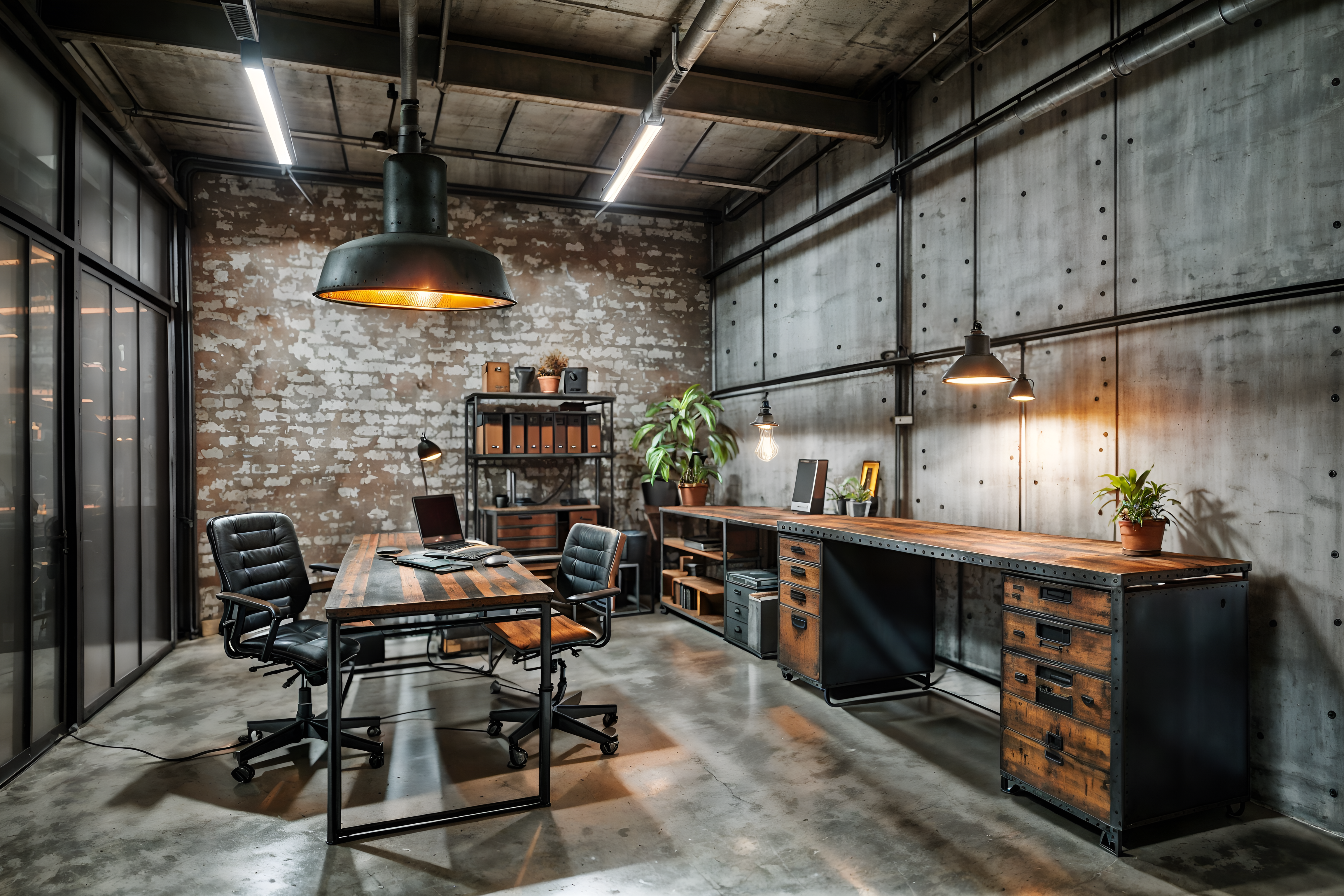 photo from pinterest of industrial-style interior designed (home office interior) with cabinets and office chair and computer desk and plant and desk lamp and cabinets. . with metal panels and factory style and exposed concrete and exposed rafters and exposed brick and open floorplan and raw aesthetic and reclaimed wood. . cinematic photo, highly detailed, cinematic lighting, ultra-detailed, ultrarealistic, photorealism, 8k. trending on pinterest. industrial interior design style. masterpiece, cinematic light, ultrarealistic+, photorealistic+, 8k, raw photo, realistic, sharp focus on eyes, (symmetrical eyes), (intact eyes), hyperrealistic, highest quality, best quality, , highly detailed, masterpiece, best quality, extremely detailed 8k wallpaper, masterpiece, best quality, ultra-detailed, best shadow, detailed background, detailed face, detailed eyes, high contrast, best illumination, detailed face, dulux, caustic, dynamic angle, detailed glow. dramatic lighting. highly detailed, insanely detailed hair, symmetrical, intricate details, professionally retouched, 8k high definition. strong bokeh. award winning photo.