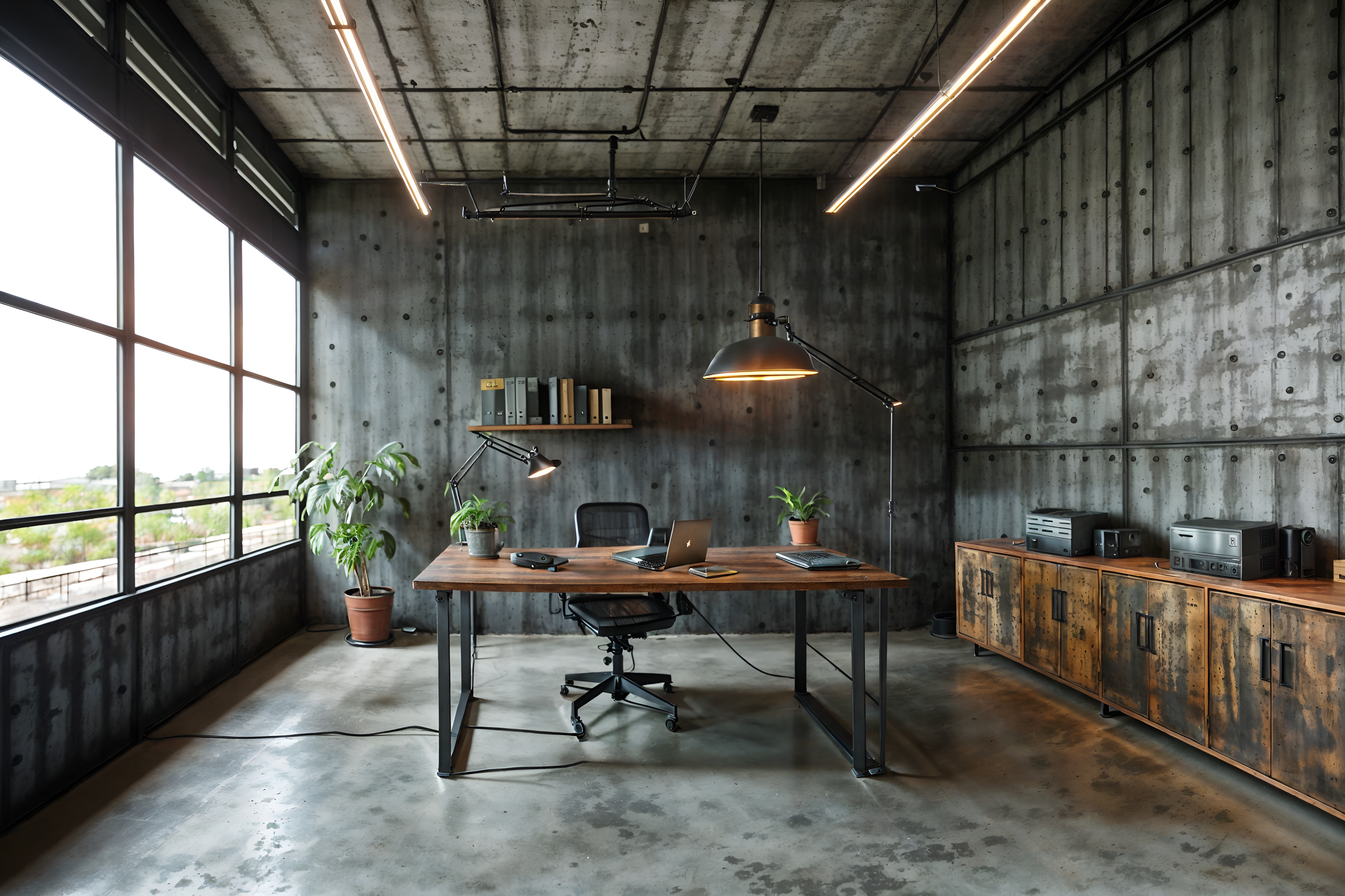 photo from pinterest of industrial-style interior designed (home office interior) with cabinets and office chair and computer desk and plant and desk lamp and cabinets. . with metal panels and factory style and exposed concrete and exposed rafters and exposed brick and open floorplan and raw aesthetic and reclaimed wood. . cinematic photo, highly detailed, cinematic lighting, ultra-detailed, ultrarealistic, photorealism, 8k. trending on pinterest. industrial interior design style. masterpiece, cinematic light, ultrarealistic+, photorealistic+, 8k, raw photo, realistic, sharp focus on eyes, (symmetrical eyes), (intact eyes), hyperrealistic, highest quality, best quality, , highly detailed, masterpiece, best quality, extremely detailed 8k wallpaper, masterpiece, best quality, ultra-detailed, best shadow, detailed background, detailed face, detailed eyes, high contrast, best illumination, detailed face, dulux, caustic, dynamic angle, detailed glow. dramatic lighting. highly detailed, insanely detailed hair, symmetrical, intricate details, professionally retouched, 8k high definition. strong bokeh. award winning photo.