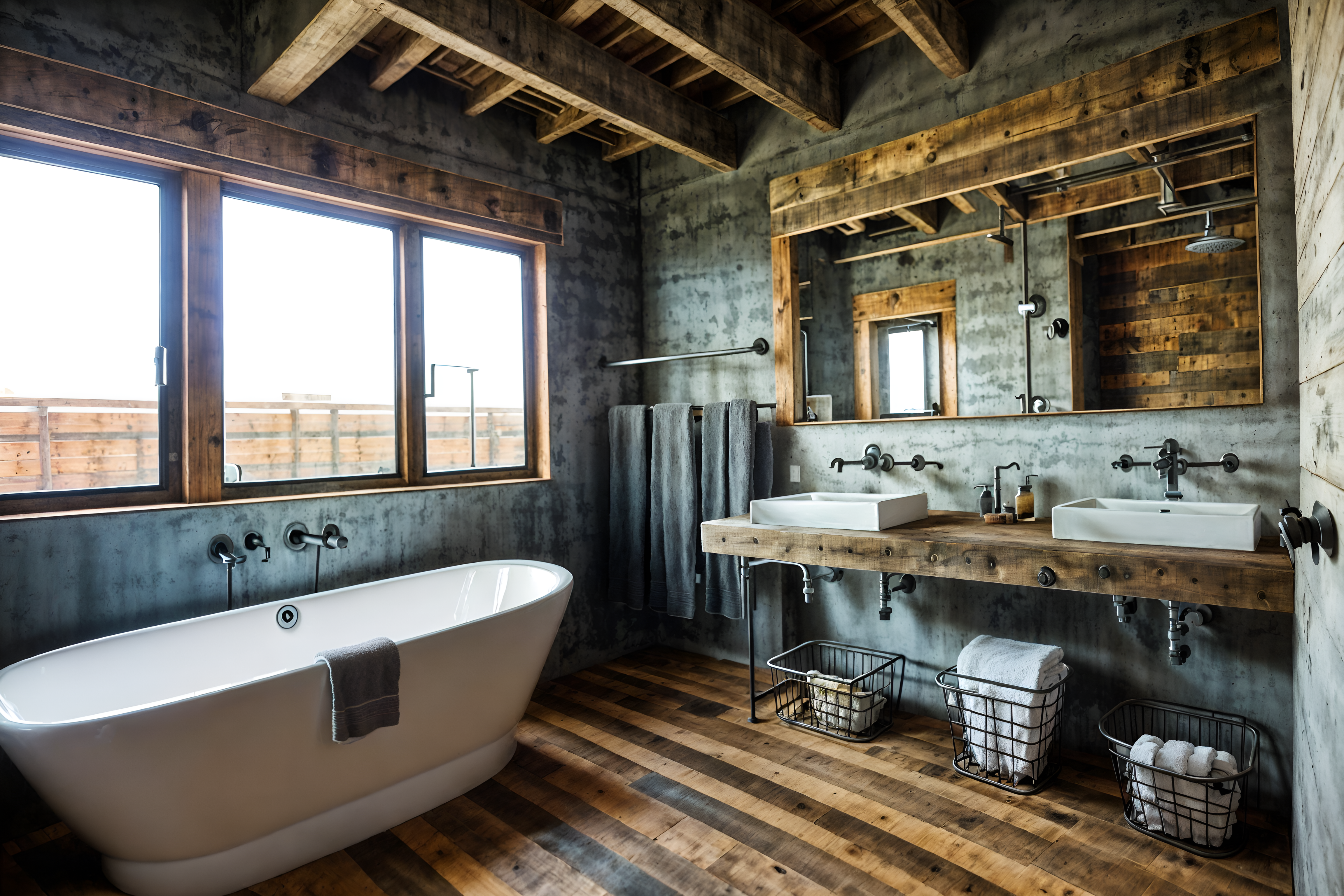 photo from pinterest of industrial-style interior designed (hotel bathroom interior) with toilet seat and shower and bathroom sink with faucet and bathroom cabinet and mirror and bath rail and waste basket and bath towel. . with exposed rafters and reclaimed wood and exposed concrete and utilitarian objects and exposed brick and factory style and neutral tones and open floorplan. . cinematic photo, highly detailed, cinematic lighting, ultra-detailed, ultrarealistic, photorealism, 8k. trending on pinterest. industrial interior design style. masterpiece, cinematic light, ultrarealistic+, photorealistic+, 8k, raw photo, realistic, sharp focus on eyes, (symmetrical eyes), (intact eyes), hyperrealistic, highest quality, best quality, , highly detailed, masterpiece, best quality, extremely detailed 8k wallpaper, masterpiece, best quality, ultra-detailed, best shadow, detailed background, detailed face, detailed eyes, high contrast, best illumination, detailed face, dulux, caustic, dynamic angle, detailed glow. dramatic lighting. highly detailed, insanely detailed hair, symmetrical, intricate details, professionally retouched, 8k high definition. strong bokeh. award winning photo.