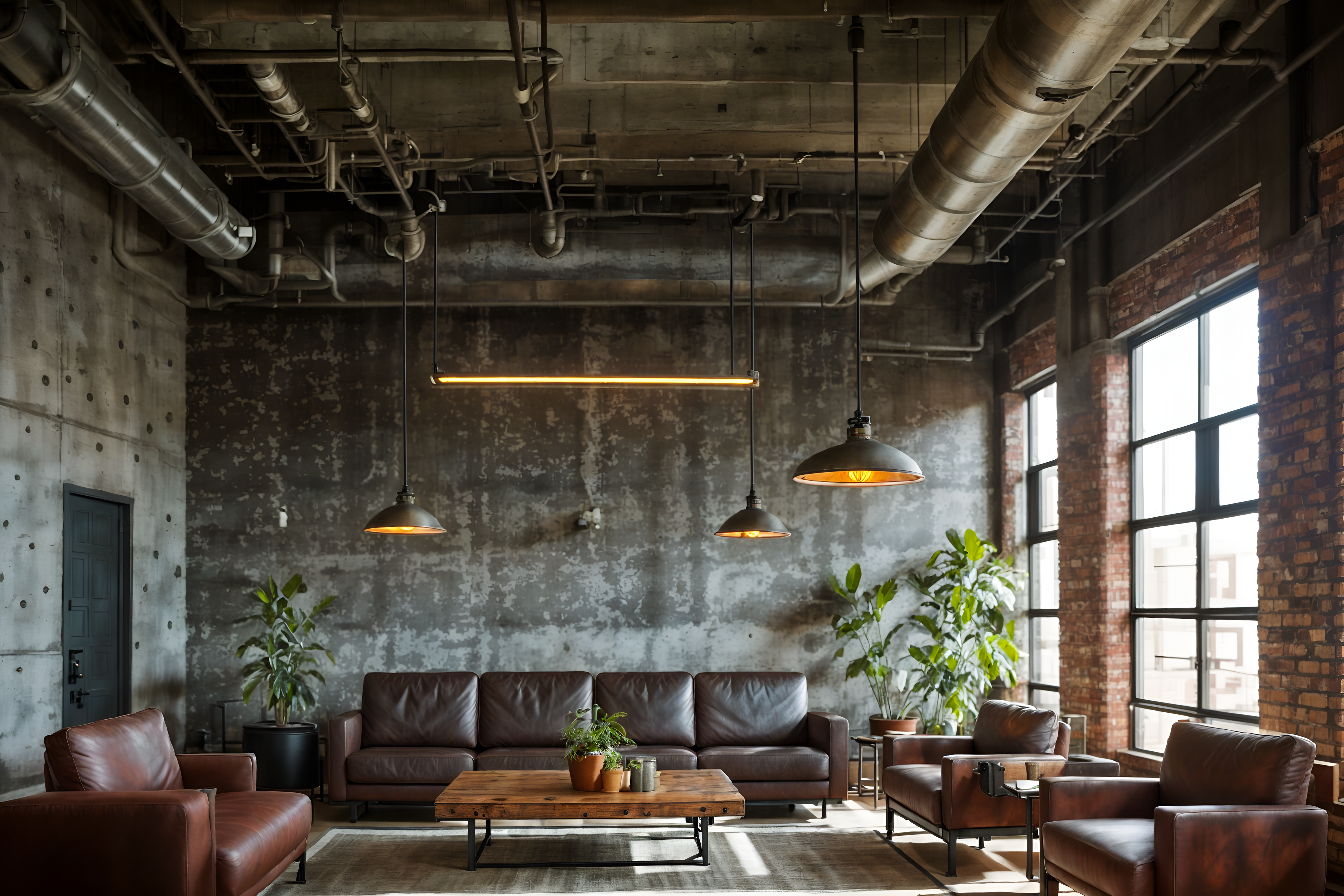 photo from pinterest of industrial-style interior designed (hotel lobby interior) with furniture and lounge chairs and hanging lamps and check in desk and coffee tables and plant and rug and sofas. . with exposed brick and exposed concrete and factory style and open floorplan and exposed rafters and utilitarian objects and reclaimed wood and metal panels. . cinematic photo, highly detailed, cinematic lighting, ultra-detailed, ultrarealistic, photorealism, 8k. trending on pinterest. industrial interior design style. masterpiece, cinematic light, ultrarealistic+, photorealistic+, 8k, raw photo, realistic, sharp focus on eyes, (symmetrical eyes), (intact eyes), hyperrealistic, highest quality, best quality, , highly detailed, masterpiece, best quality, extremely detailed 8k wallpaper, masterpiece, best quality, ultra-detailed, best shadow, detailed background, detailed face, detailed eyes, high contrast, best illumination, detailed face, dulux, caustic, dynamic angle, detailed glow. dramatic lighting. highly detailed, insanely detailed hair, symmetrical, intricate details, professionally retouched, 8k high definition. strong bokeh. award winning photo.
