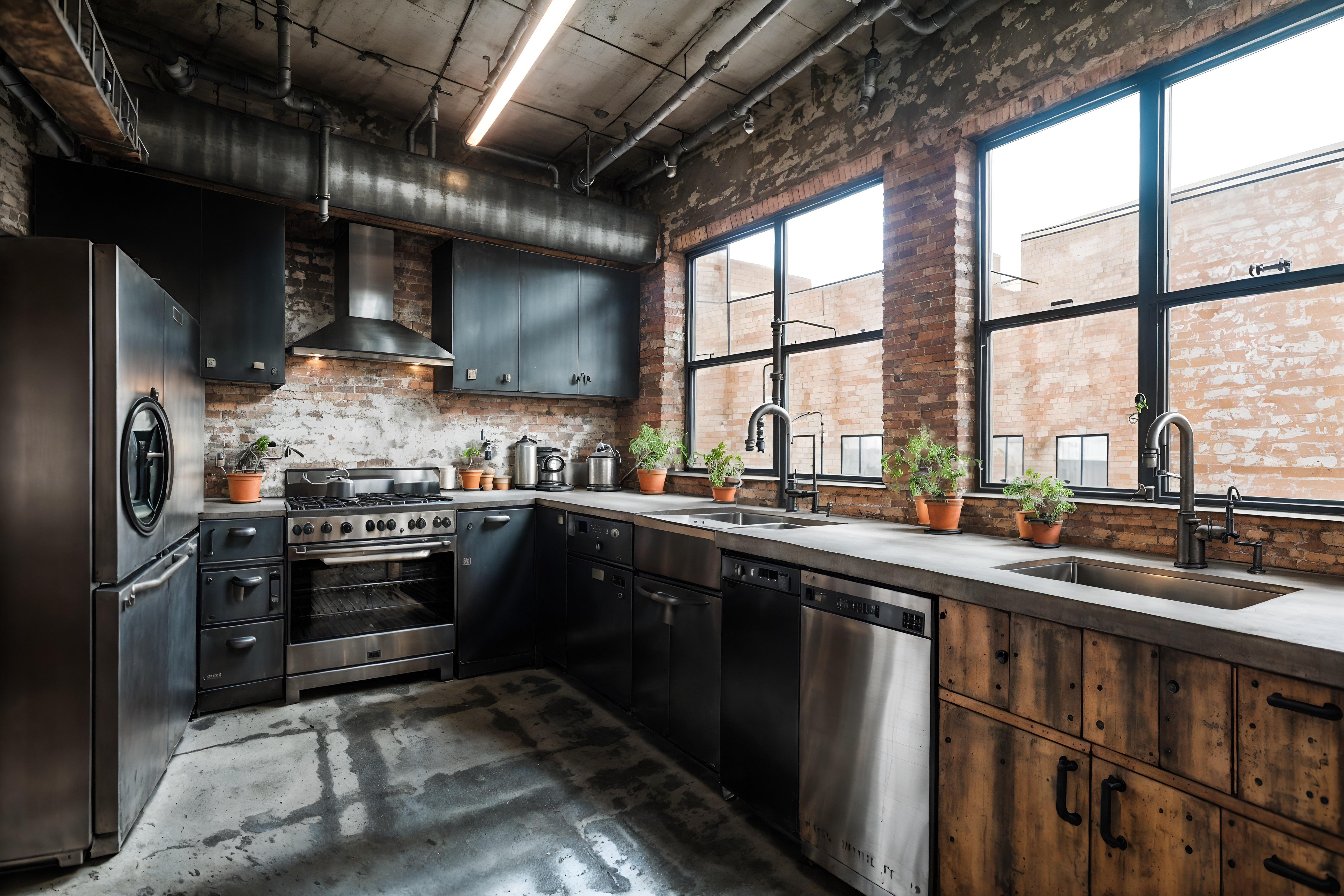 photo from pinterest of industrial-style interior designed (kitchen interior) with sink and plant and stove and refrigerator and kitchen cabinets and worktops and sink. . with exposed brick and raw aesthetic and exposed rafters and open floorplan and metal panels and neutral tones and utilitarian objects and exposed concrete. . cinematic photo, highly detailed, cinematic lighting, ultra-detailed, ultrarealistic, photorealism, 8k. trending on pinterest. industrial interior design style. masterpiece, cinematic light, ultrarealistic+, photorealistic+, 8k, raw photo, realistic, sharp focus on eyes, (symmetrical eyes), (intact eyes), hyperrealistic, highest quality, best quality, , highly detailed, masterpiece, best quality, extremely detailed 8k wallpaper, masterpiece, best quality, ultra-detailed, best shadow, detailed background, detailed face, detailed eyes, high contrast, best illumination, detailed face, dulux, caustic, dynamic angle, detailed glow. dramatic lighting. highly detailed, insanely detailed hair, symmetrical, intricate details, professionally retouched, 8k high definition. strong bokeh. award winning photo.