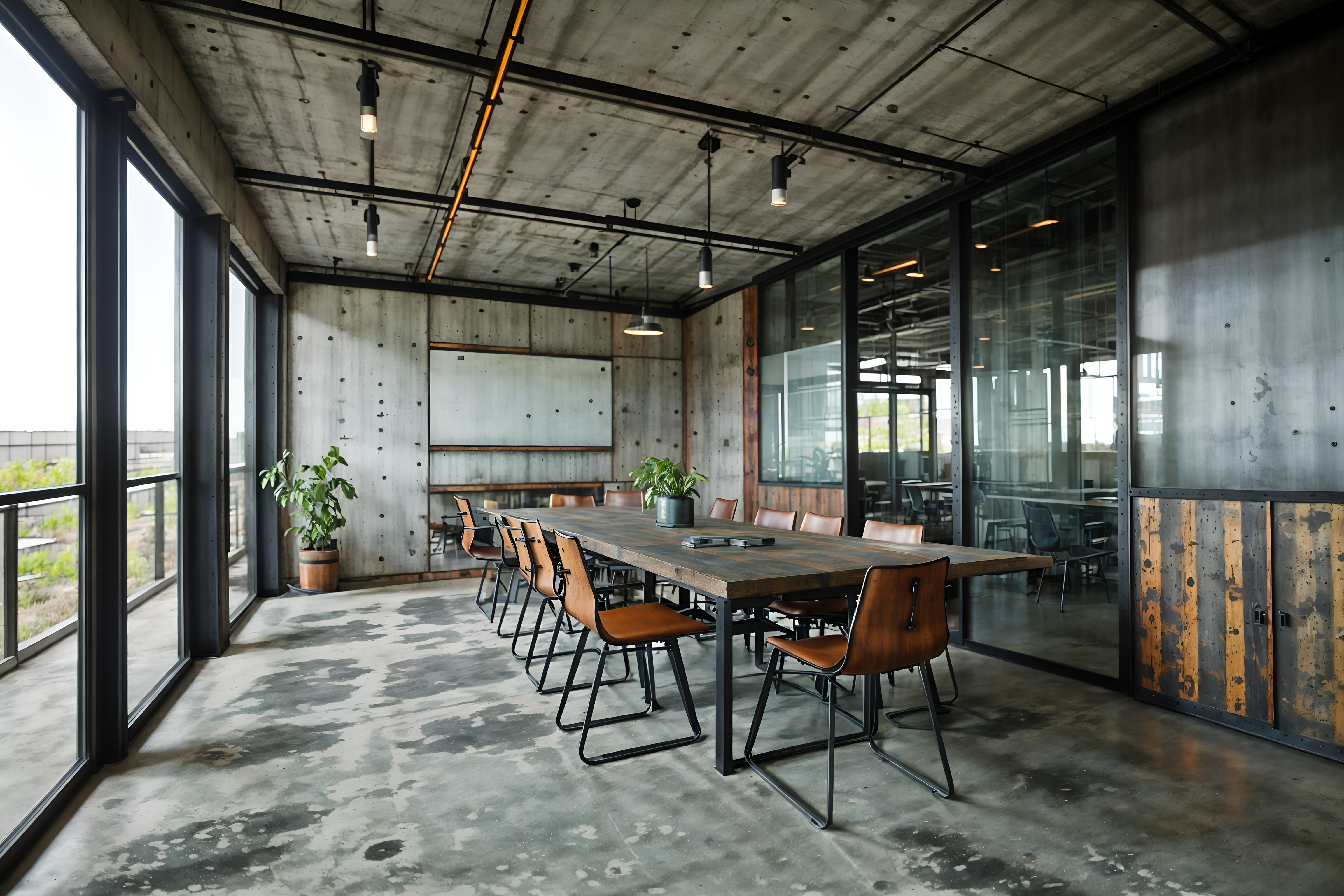 photo from pinterest of industrial-style interior designed (meeting room interior) with glass doors and office chairs and boardroom table and glass walls and cabinets and vase and plant and painting or photo on wall. . with exposed concrete and open floorplan and reclaimed wood and exposed rafters and utilitarian objects and raw aesthetic and factory style and metal panels. . cinematic photo, highly detailed, cinematic lighting, ultra-detailed, ultrarealistic, photorealism, 8k. trending on pinterest. industrial interior design style. masterpiece, cinematic light, ultrarealistic+, photorealistic+, 8k, raw photo, realistic, sharp focus on eyes, (symmetrical eyes), (intact eyes), hyperrealistic, highest quality, best quality, , highly detailed, masterpiece, best quality, extremely detailed 8k wallpaper, masterpiece, best quality, ultra-detailed, best shadow, detailed background, detailed face, detailed eyes, high contrast, best illumination, detailed face, dulux, caustic, dynamic angle, detailed glow. dramatic lighting. highly detailed, insanely detailed hair, symmetrical, intricate details, professionally retouched, 8k high definition. strong bokeh. award winning photo.