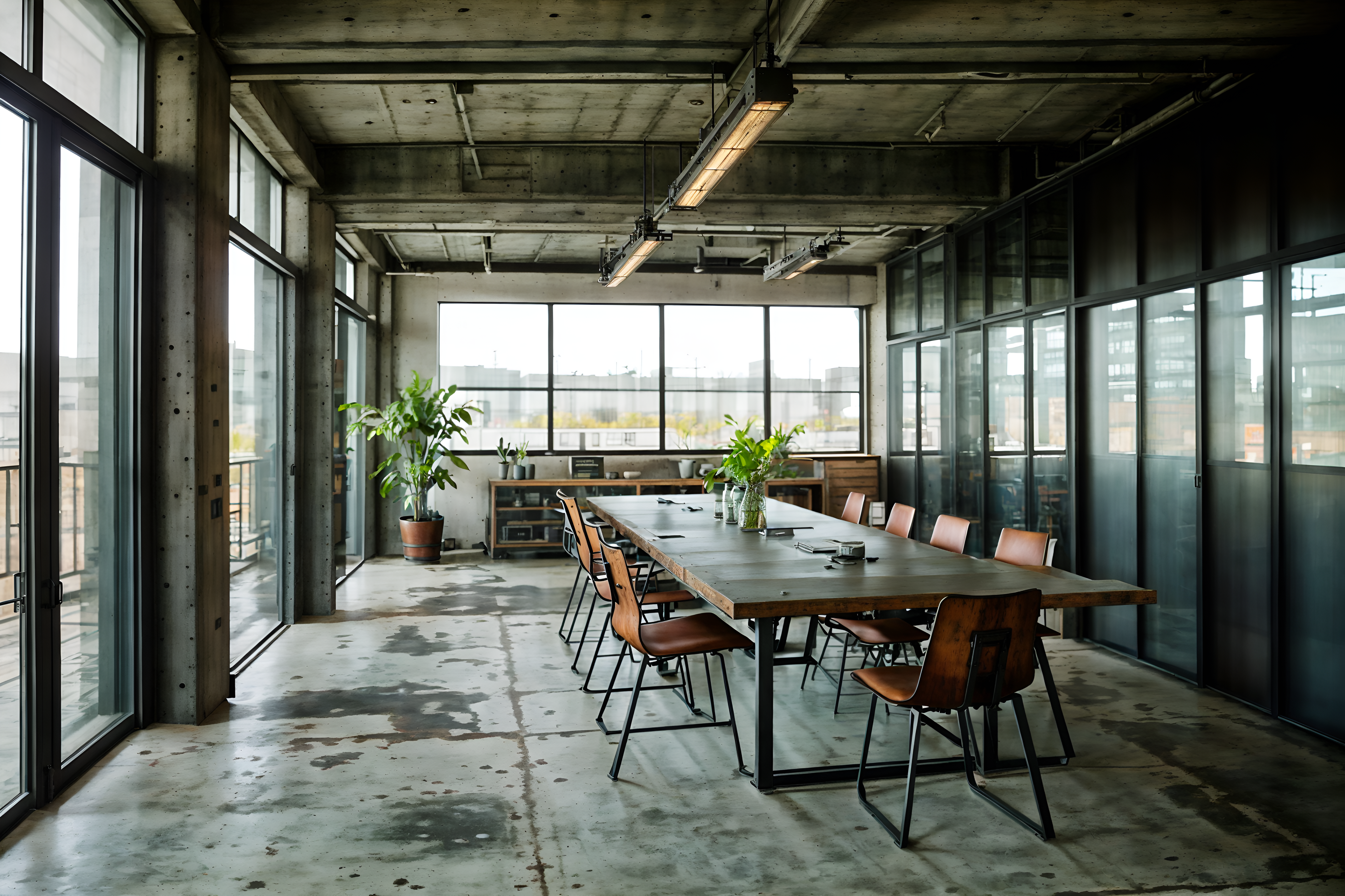 photo from pinterest of industrial-style interior designed (meeting room interior) with glass doors and office chairs and boardroom table and glass walls and cabinets and vase and plant and painting or photo on wall. . with exposed concrete and open floorplan and reclaimed wood and exposed rafters and utilitarian objects and raw aesthetic and factory style and metal panels. . cinematic photo, highly detailed, cinematic lighting, ultra-detailed, ultrarealistic, photorealism, 8k. trending on pinterest. industrial interior design style. masterpiece, cinematic light, ultrarealistic+, photorealistic+, 8k, raw photo, realistic, sharp focus on eyes, (symmetrical eyes), (intact eyes), hyperrealistic, highest quality, best quality, , highly detailed, masterpiece, best quality, extremely detailed 8k wallpaper, masterpiece, best quality, ultra-detailed, best shadow, detailed background, detailed face, detailed eyes, high contrast, best illumination, detailed face, dulux, caustic, dynamic angle, detailed glow. dramatic lighting. highly detailed, insanely detailed hair, symmetrical, intricate details, professionally retouched, 8k high definition. strong bokeh. award winning photo.