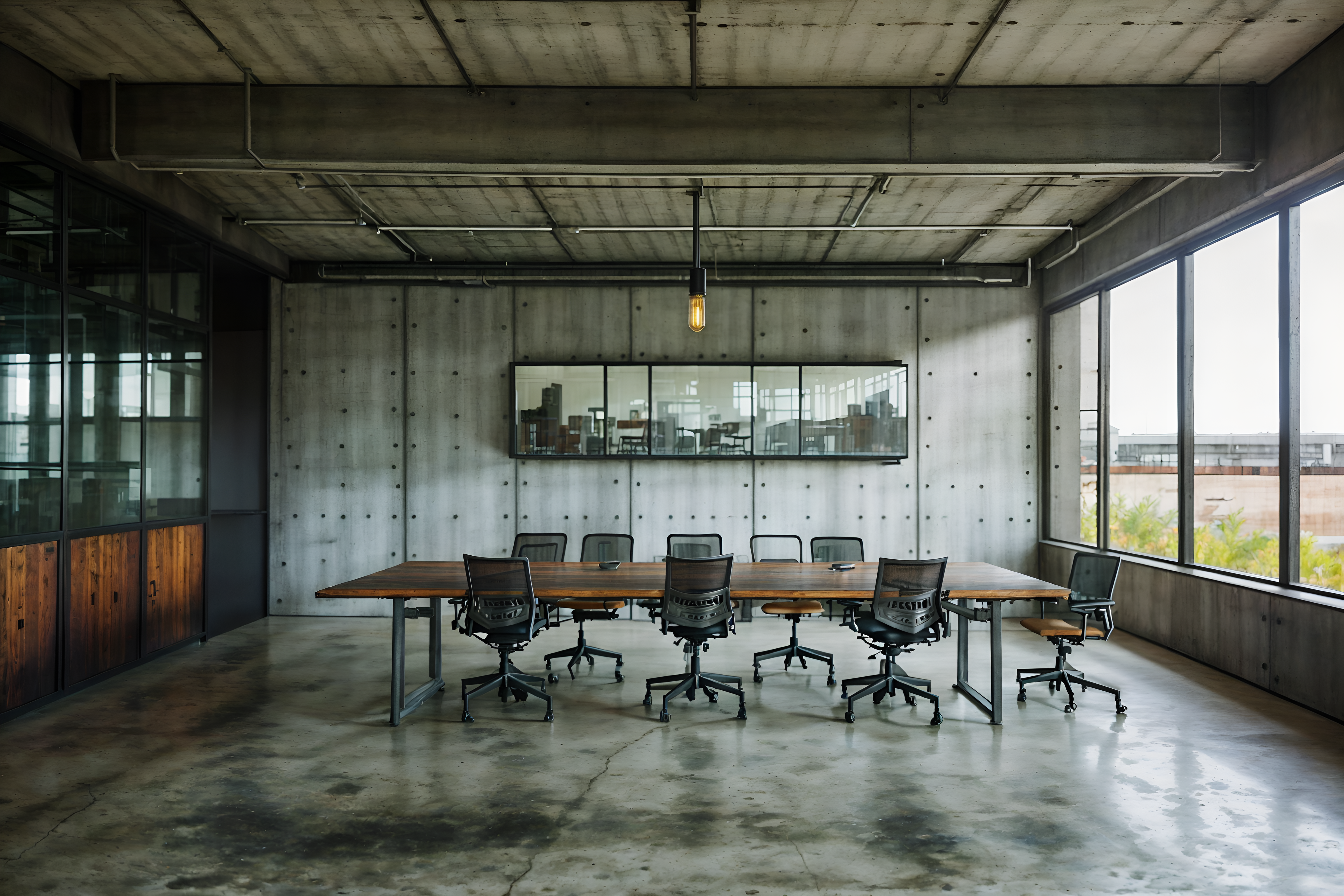 photo from pinterest of industrial-style interior designed (meeting room interior) with glass doors and office chairs and boardroom table and glass walls and cabinets and vase and plant and painting or photo on wall. . with exposed concrete and open floorplan and reclaimed wood and exposed rafters and utilitarian objects and raw aesthetic and factory style and metal panels. . cinematic photo, highly detailed, cinematic lighting, ultra-detailed, ultrarealistic, photorealism, 8k. trending on pinterest. industrial interior design style. masterpiece, cinematic light, ultrarealistic+, photorealistic+, 8k, raw photo, realistic, sharp focus on eyes, (symmetrical eyes), (intact eyes), hyperrealistic, highest quality, best quality, , highly detailed, masterpiece, best quality, extremely detailed 8k wallpaper, masterpiece, best quality, ultra-detailed, best shadow, detailed background, detailed face, detailed eyes, high contrast, best illumination, detailed face, dulux, caustic, dynamic angle, detailed glow. dramatic lighting. highly detailed, insanely detailed hair, symmetrical, intricate details, professionally retouched, 8k high definition. strong bokeh. award winning photo.