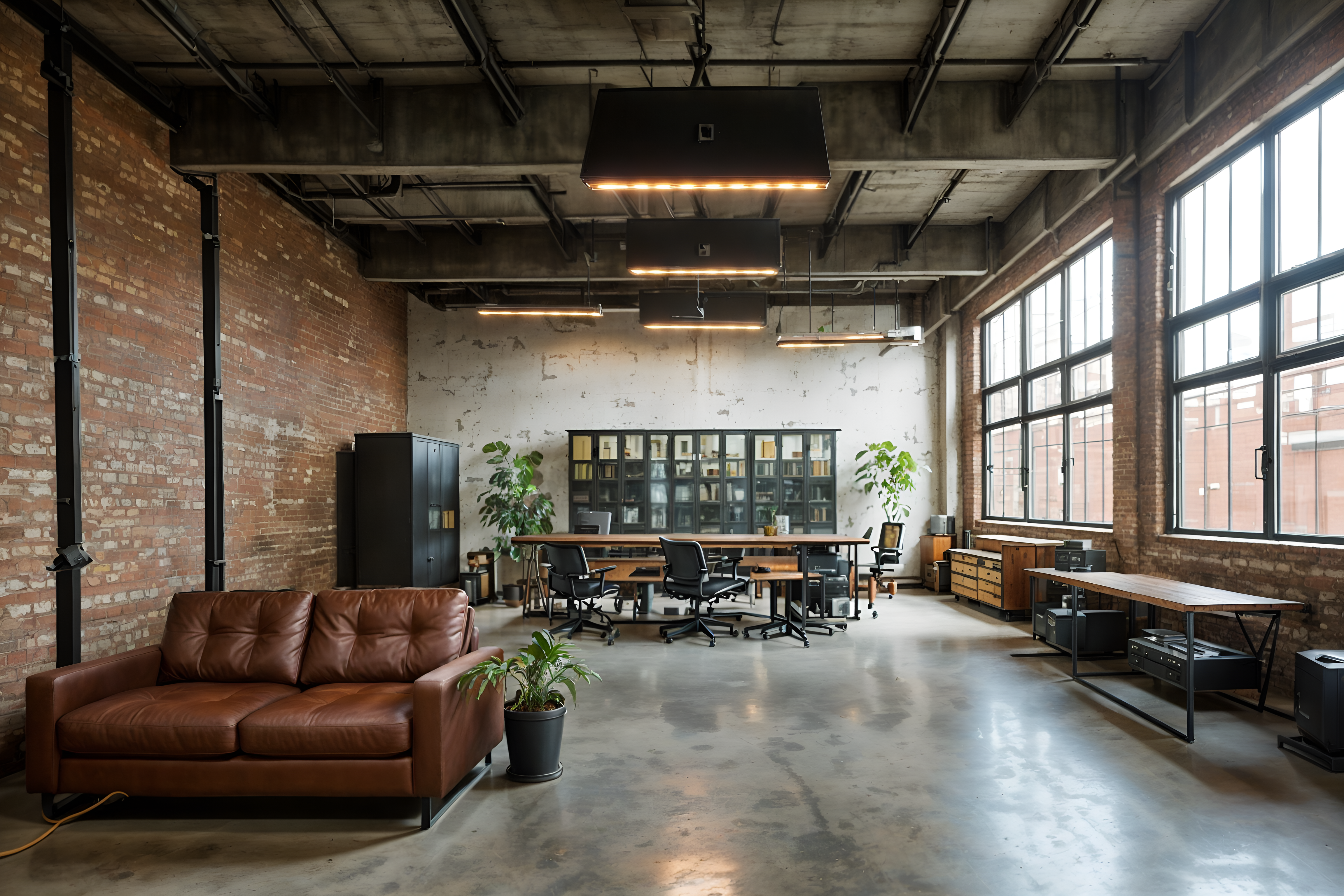 photo from pinterest of industrial-style interior designed (office interior) with office desks and computer desks and lounge chairs and cabinets and desk lamps and windows and seating area with sofa and plants. . with exposed rafters and reclaimed wood and factory style and utilitarian objects and neutral tones and metal panels and exposed brick and open floorplan. . cinematic photo, highly detailed, cinematic lighting, ultra-detailed, ultrarealistic, photorealism, 8k. trending on pinterest. industrial interior design style. masterpiece, cinematic light, ultrarealistic+, photorealistic+, 8k, raw photo, realistic, sharp focus on eyes, (symmetrical eyes), (intact eyes), hyperrealistic, highest quality, best quality, , highly detailed, masterpiece, best quality, extremely detailed 8k wallpaper, masterpiece, best quality, ultra-detailed, best shadow, detailed background, detailed face, detailed eyes, high contrast, best illumination, detailed face, dulux, caustic, dynamic angle, detailed glow. dramatic lighting. highly detailed, insanely detailed hair, symmetrical, intricate details, professionally retouched, 8k high definition. strong bokeh. award winning photo.