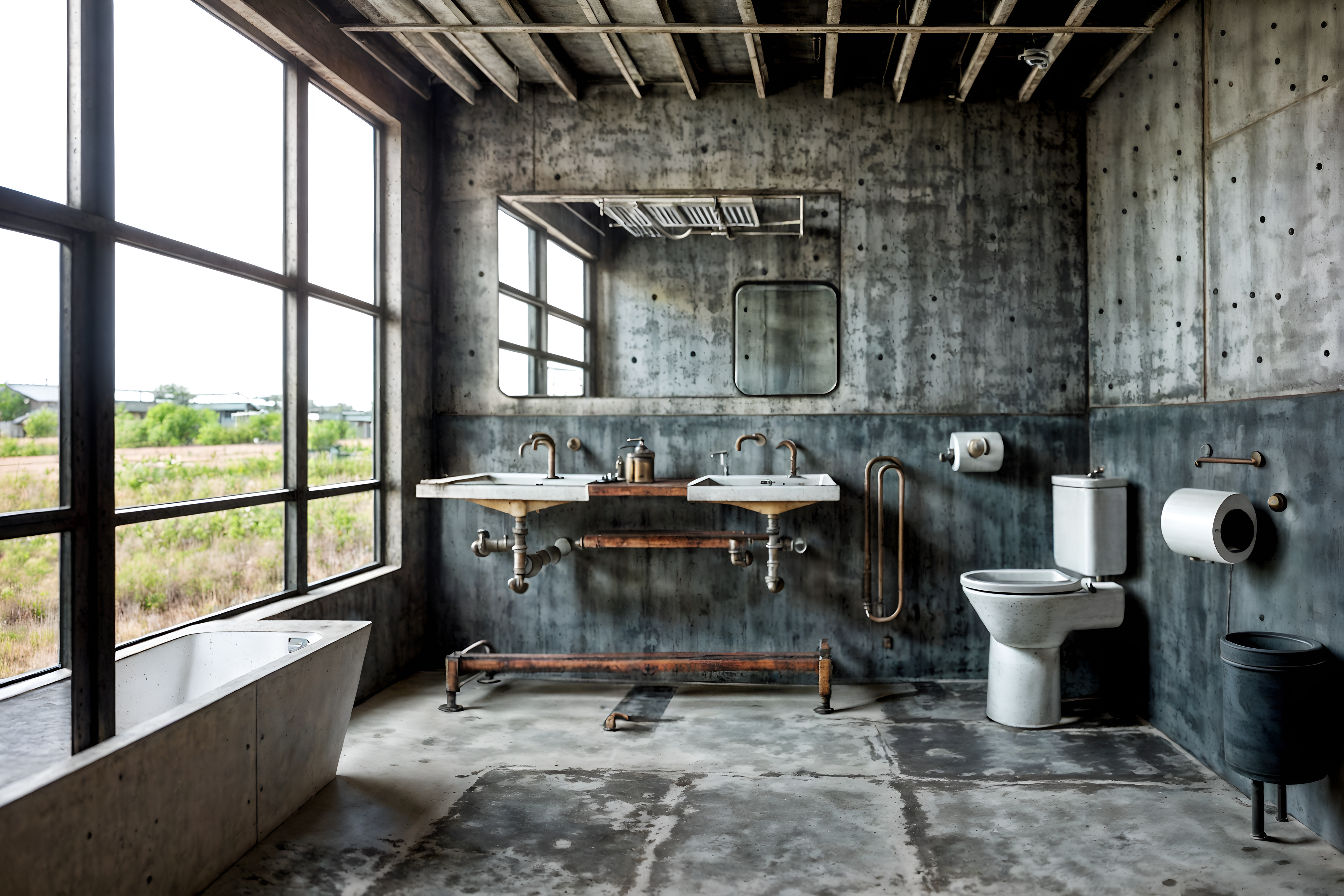photo from pinterest of industrial-style interior designed (toilet interior) with sink with tap and toilet paper hanger and toilet with toilet seat up and sink with tap. . with neutral tones and metal panels and exposed concrete and exposed rafters and reclaimed wood and raw aesthetic and open floorplan and exposed brick. . cinematic photo, highly detailed, cinematic lighting, ultra-detailed, ultrarealistic, photorealism, 8k. trending on pinterest. industrial interior design style. masterpiece, cinematic light, ultrarealistic+, photorealistic+, 8k, raw photo, realistic, sharp focus on eyes, (symmetrical eyes), (intact eyes), hyperrealistic, highest quality, best quality, , highly detailed, masterpiece, best quality, extremely detailed 8k wallpaper, masterpiece, best quality, ultra-detailed, best shadow, detailed background, detailed face, detailed eyes, high contrast, best illumination, detailed face, dulux, caustic, dynamic angle, detailed glow. dramatic lighting. highly detailed, insanely detailed hair, symmetrical, intricate details, professionally retouched, 8k high definition. strong bokeh. award winning photo.