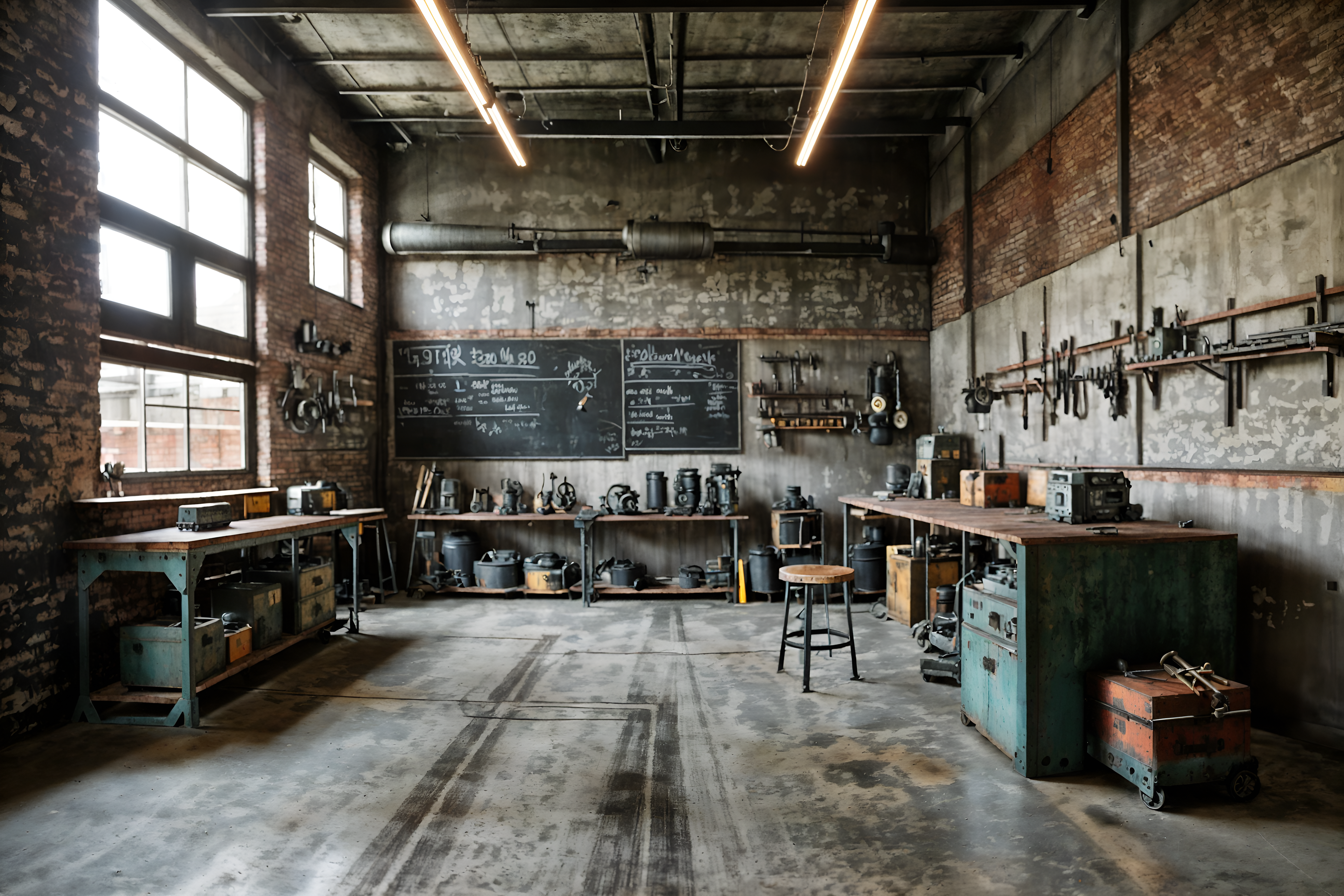 photo from pinterest of industrial-style interior designed (workshop interior) with tool wall and wooden workbench and messy and tool wall. . with utilitarian objects and exposed concrete and metal panels and neutral tones and factory style and exposed brick and reclaimed wood and exposed rafters. . cinematic photo, highly detailed, cinematic lighting, ultra-detailed, ultrarealistic, photorealism, 8k. trending on pinterest. industrial interior design style. masterpiece, cinematic light, ultrarealistic+, photorealistic+, 8k, raw photo, realistic, sharp focus on eyes, (symmetrical eyes), (intact eyes), hyperrealistic, highest quality, best quality, , highly detailed, masterpiece, best quality, extremely detailed 8k wallpaper, masterpiece, best quality, ultra-detailed, best shadow, detailed background, detailed face, detailed eyes, high contrast, best illumination, detailed face, dulux, caustic, dynamic angle, detailed glow. dramatic lighting. highly detailed, insanely detailed hair, symmetrical, intricate details, professionally retouched, 8k high definition. strong bokeh. award winning photo.