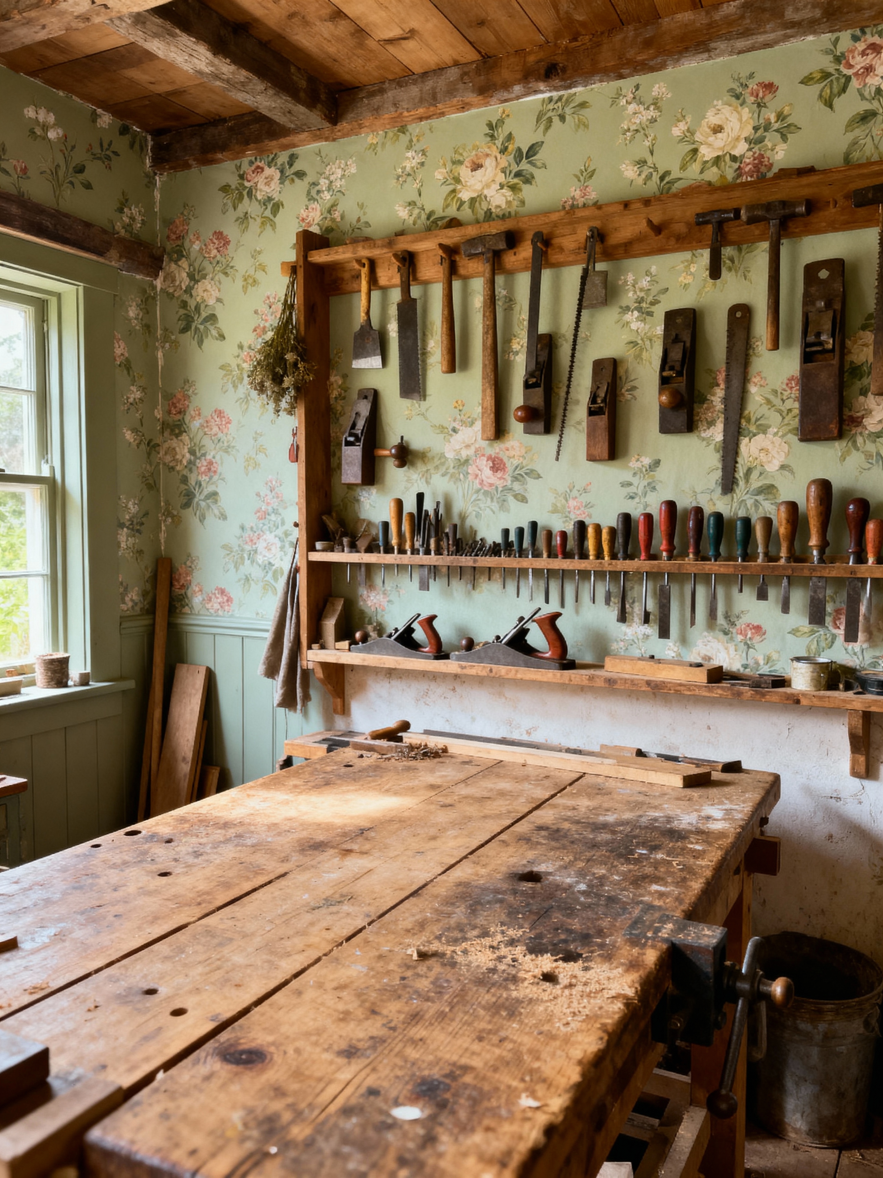 workshop with cottagecore style with tool wall and wooden workbench and messy and tool wall. . with organic and muted colors and cottage style and earthy and floral patterns and traditional and country style and natural