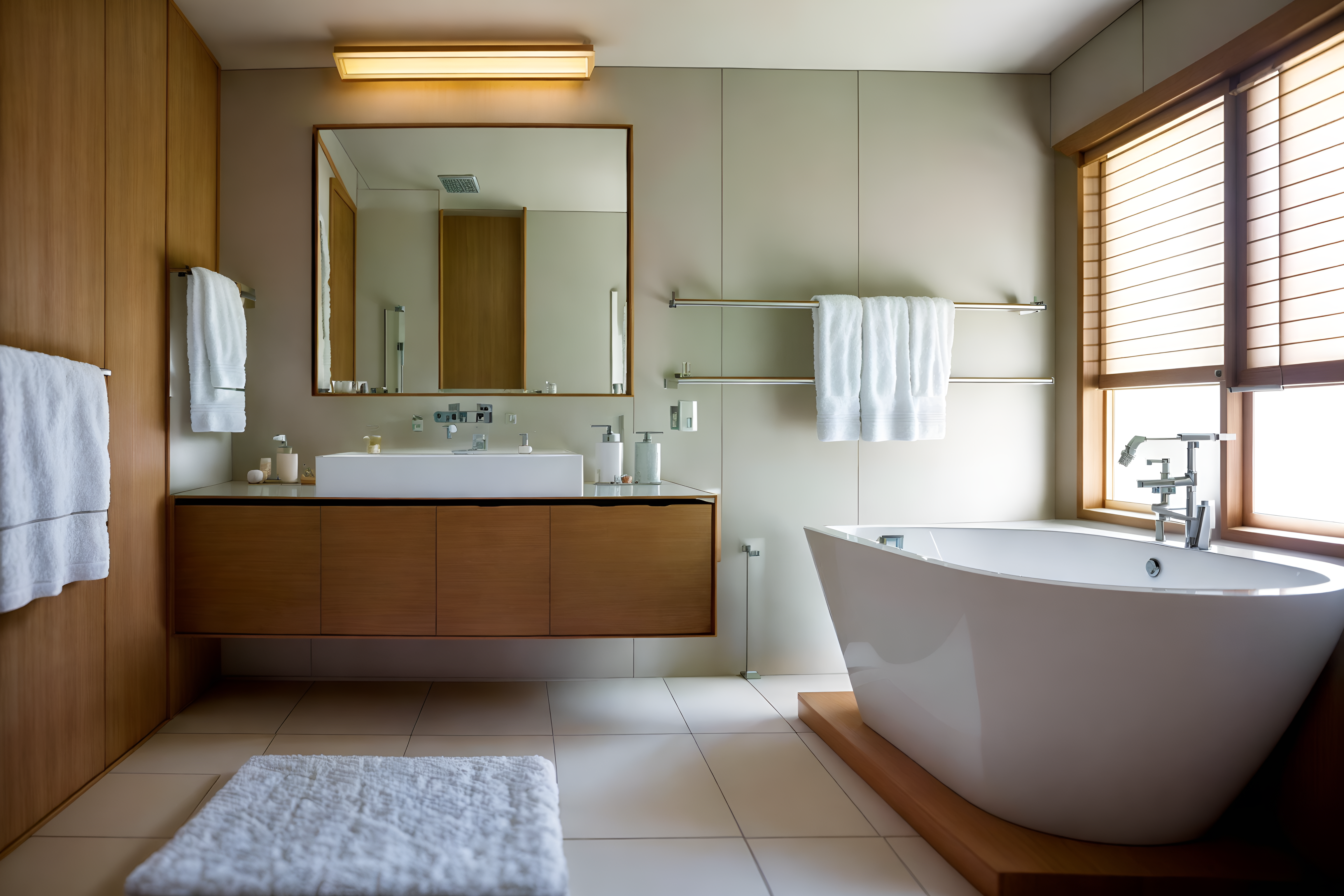 photo from pinterest of japanese design-style interior designed (bathroom interior) with waste basket and mirror and bathroom cabinet and bathtub and bath rail and shower and bathroom sink with faucet and bath towel. . with . . cinematic photo, highly detailed, cinematic lighting, ultra-detailed, ultrarealistic, photorealism, 8k. trending on pinterest. japanese design interior design style. masterpiece, cinematic light, ultrarealistic+, photorealistic+, 8k, raw photo, realistic, sharp focus on eyes, (symmetrical eyes), (intact eyes), hyperrealistic, highest quality, best quality, , highly detailed, masterpiece, best quality, extremely detailed 8k wallpaper, masterpiece, best quality, ultra-detailed, best shadow, detailed background, detailed face, detailed eyes, high contrast, best illumination, detailed face, dulux, caustic, dynamic angle, detailed glow. dramatic lighting. highly detailed, insanely detailed hair, symmetrical, intricate details, professionally retouched, 8k high definition. strong bokeh. award winning photo.