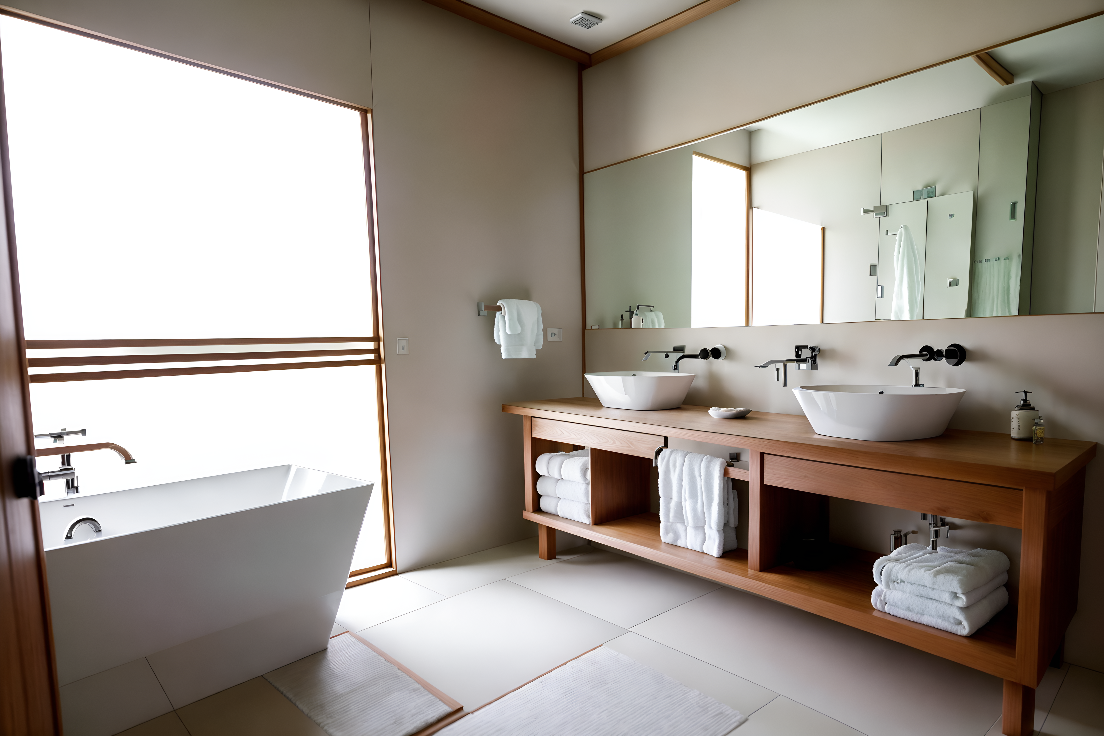 photo from pinterest of japanese design-style interior designed (bathroom interior) with waste basket and mirror and bathroom cabinet and bathtub and bath rail and shower and bathroom sink with faucet and bath towel. . with . . cinematic photo, highly detailed, cinematic lighting, ultra-detailed, ultrarealistic, photorealism, 8k. trending on pinterest. japanese design interior design style. masterpiece, cinematic light, ultrarealistic+, photorealistic+, 8k, raw photo, realistic, sharp focus on eyes, (symmetrical eyes), (intact eyes), hyperrealistic, highest quality, best quality, , highly detailed, masterpiece, best quality, extremely detailed 8k wallpaper, masterpiece, best quality, ultra-detailed, best shadow, detailed background, detailed face, detailed eyes, high contrast, best illumination, detailed face, dulux, caustic, dynamic angle, detailed glow. dramatic lighting. highly detailed, insanely detailed hair, symmetrical, intricate details, professionally retouched, 8k high definition. strong bokeh. award winning photo.