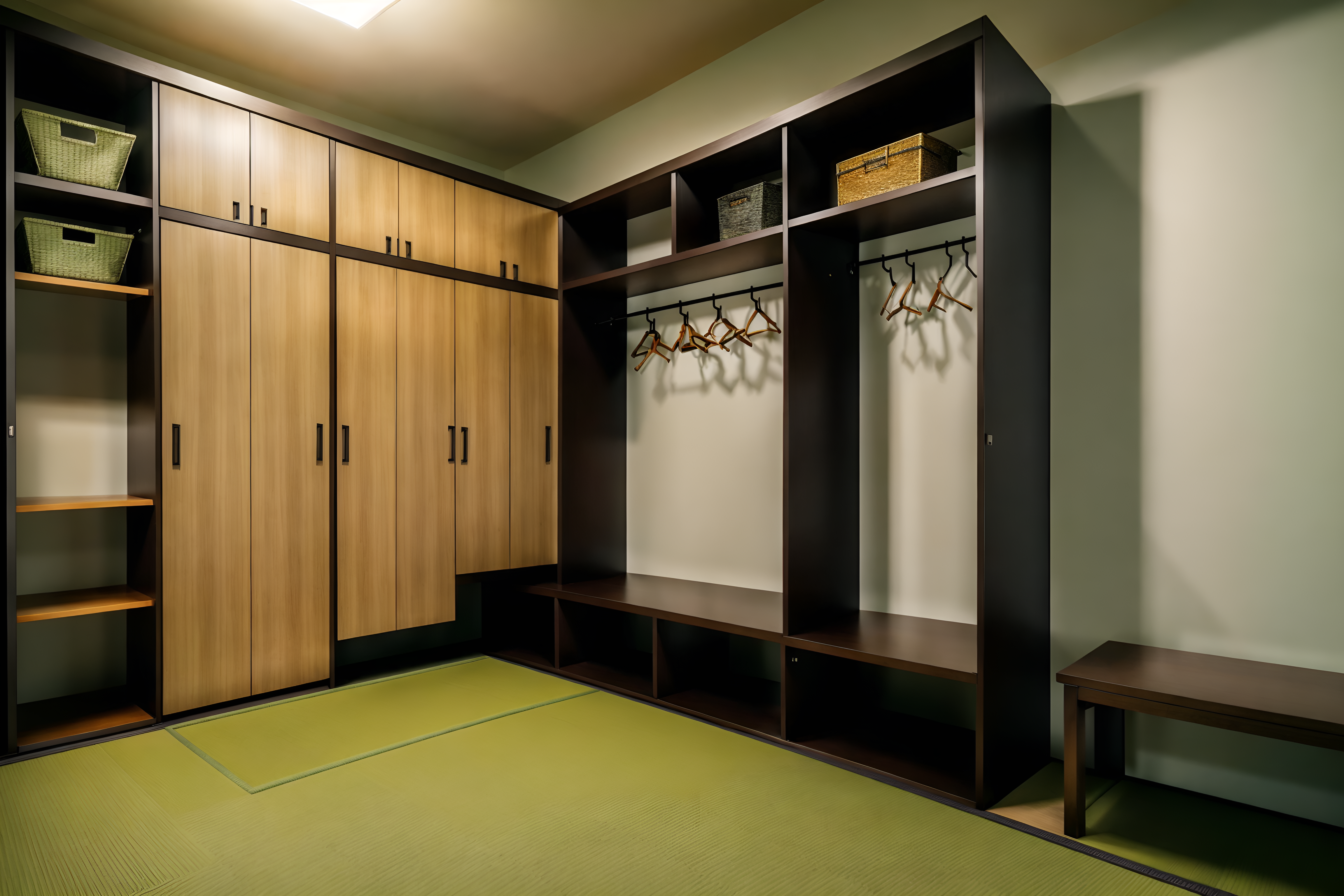 photo from pinterest of japanese design-style interior designed (drop zone interior) with cubbies and wall hooks for coats and high up storage and a bench and shelves for shoes and lockers and cabinets and storage baskets. . with . . cinematic photo, highly detailed, cinematic lighting, ultra-detailed, ultrarealistic, photorealism, 8k. trending on pinterest. japanese design interior design style. masterpiece, cinematic light, ultrarealistic+, photorealistic+, 8k, raw photo, realistic, sharp focus on eyes, (symmetrical eyes), (intact eyes), hyperrealistic, highest quality, best quality, , highly detailed, masterpiece, best quality, extremely detailed 8k wallpaper, masterpiece, best quality, ultra-detailed, best shadow, detailed background, detailed face, detailed eyes, high contrast, best illumination, detailed face, dulux, caustic, dynamic angle, detailed glow. dramatic lighting. highly detailed, insanely detailed hair, symmetrical, intricate details, professionally retouched, 8k high definition. strong bokeh. award winning photo.