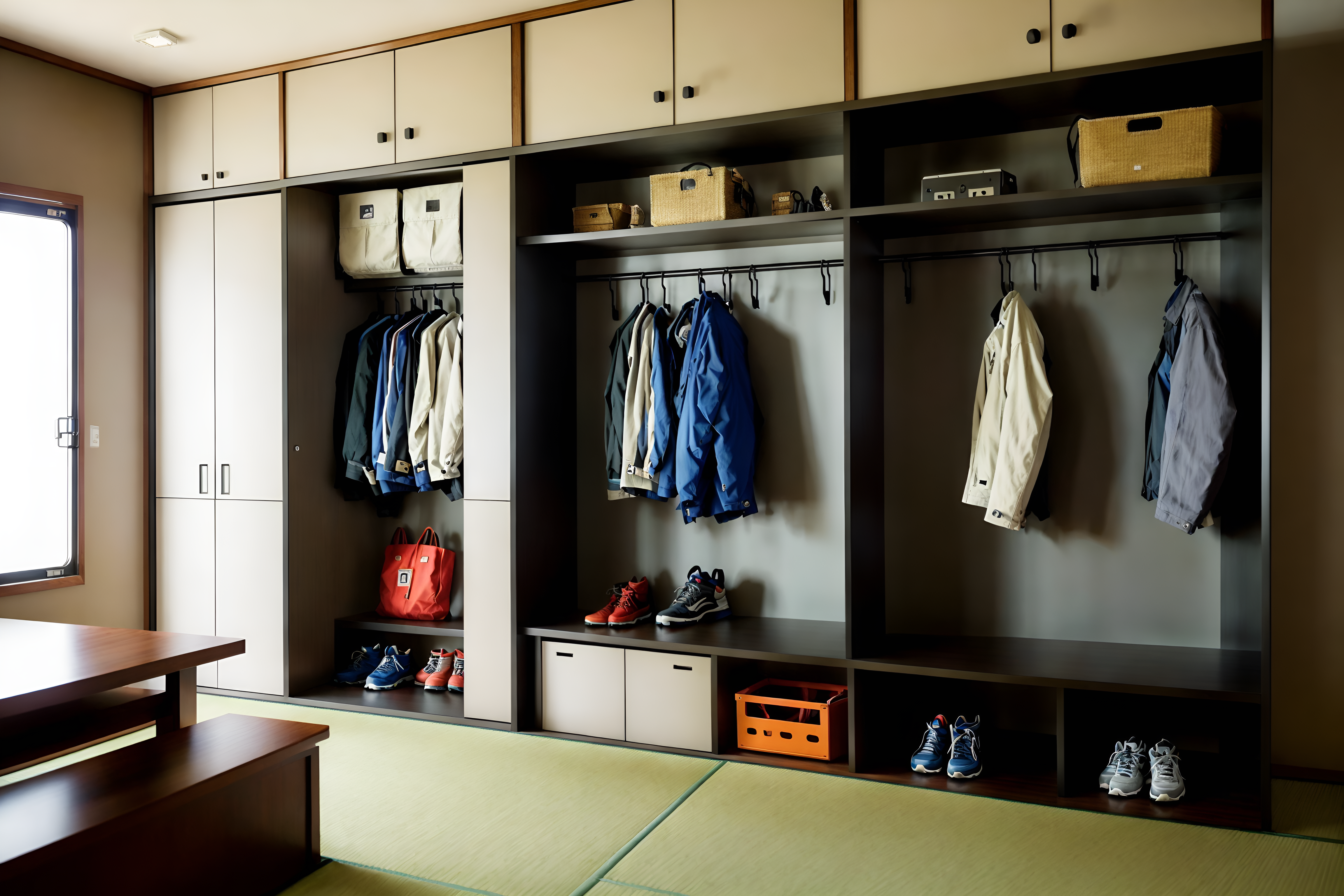 photo from pinterest of japanese design-style interior designed (drop zone interior) with cubbies and wall hooks for coats and high up storage and a bench and shelves for shoes and lockers and cabinets and storage baskets. . with . . cinematic photo, highly detailed, cinematic lighting, ultra-detailed, ultrarealistic, photorealism, 8k. trending on pinterest. japanese design interior design style. masterpiece, cinematic light, ultrarealistic+, photorealistic+, 8k, raw photo, realistic, sharp focus on eyes, (symmetrical eyes), (intact eyes), hyperrealistic, highest quality, best quality, , highly detailed, masterpiece, best quality, extremely detailed 8k wallpaper, masterpiece, best quality, ultra-detailed, best shadow, detailed background, detailed face, detailed eyes, high contrast, best illumination, detailed face, dulux, caustic, dynamic angle, detailed glow. dramatic lighting. highly detailed, insanely detailed hair, symmetrical, intricate details, professionally retouched, 8k high definition. strong bokeh. award winning photo.