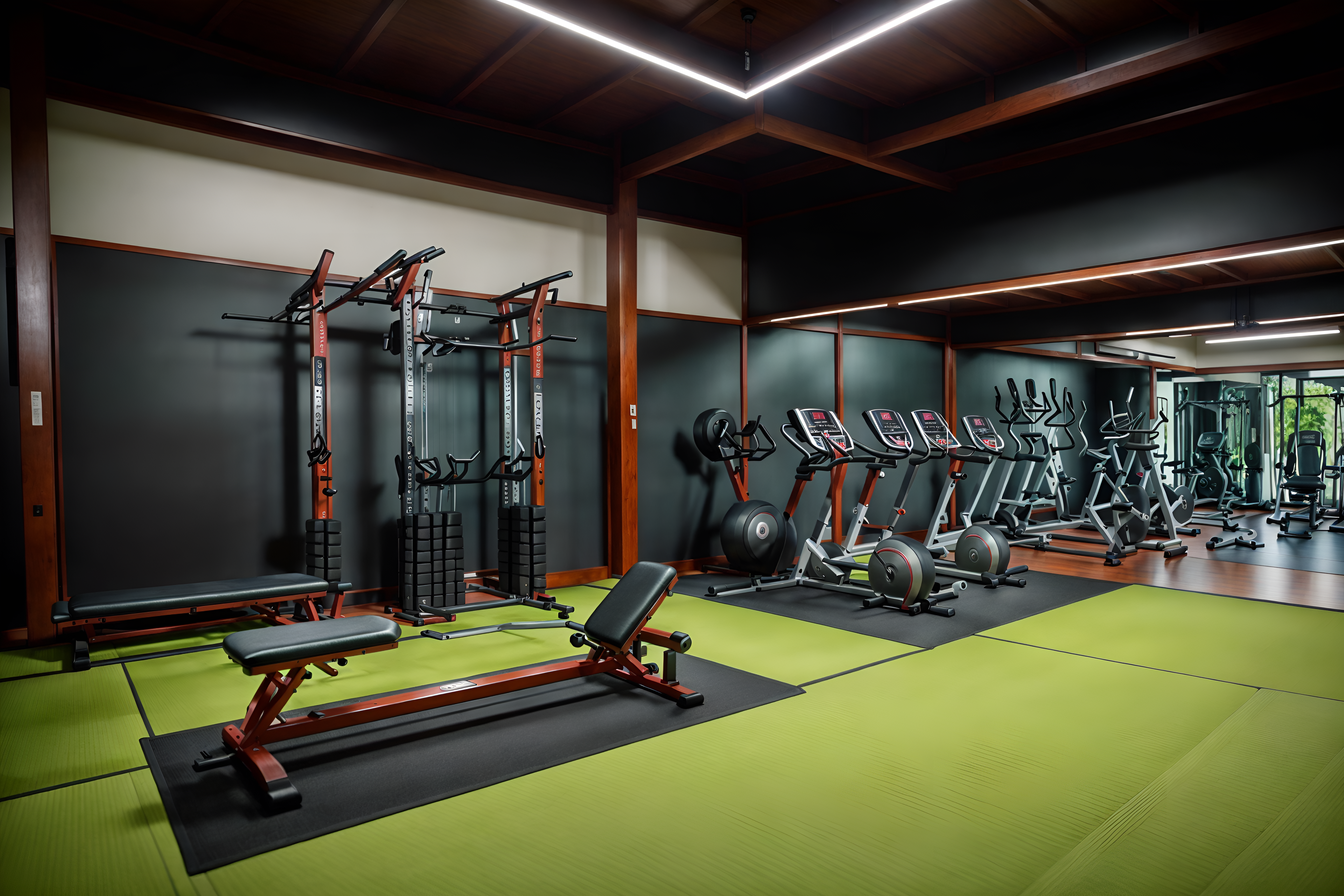 photo from pinterest of japanese design-style interior designed (fitness gym interior) with exercise bicycle and squat rack and crosstrainer and dumbbell stand and bench press and exercise bicycle. . with . . cinematic photo, highly detailed, cinematic lighting, ultra-detailed, ultrarealistic, photorealism, 8k. trending on pinterest. japanese design interior design style. masterpiece, cinematic light, ultrarealistic+, photorealistic+, 8k, raw photo, realistic, sharp focus on eyes, (symmetrical eyes), (intact eyes), hyperrealistic, highest quality, best quality, , highly detailed, masterpiece, best quality, extremely detailed 8k wallpaper, masterpiece, best quality, ultra-detailed, best shadow, detailed background, detailed face, detailed eyes, high contrast, best illumination, detailed face, dulux, caustic, dynamic angle, detailed glow. dramatic lighting. highly detailed, insanely detailed hair, symmetrical, intricate details, professionally retouched, 8k high definition. strong bokeh. award winning photo.