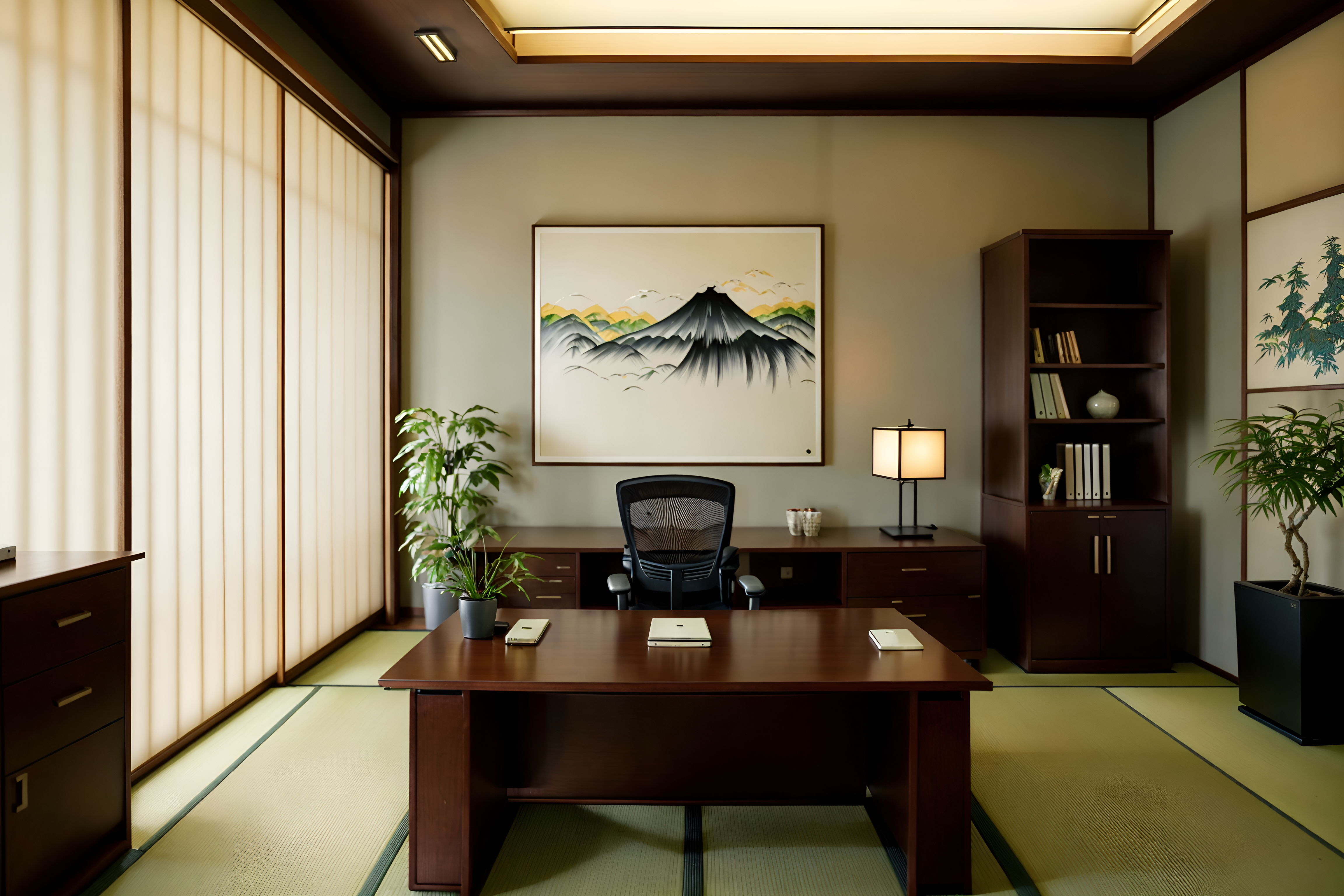 photo from pinterest of japanese design-style interior designed (home office interior) with cabinets and plant and desk lamp and office chair and computer desk and cabinets. . with . . cinematic photo, highly detailed, cinematic lighting, ultra-detailed, ultrarealistic, photorealism, 8k. trending on pinterest. japanese design interior design style. masterpiece, cinematic light, ultrarealistic+, photorealistic+, 8k, raw photo, realistic, sharp focus on eyes, (symmetrical eyes), (intact eyes), hyperrealistic, highest quality, best quality, , highly detailed, masterpiece, best quality, extremely detailed 8k wallpaper, masterpiece, best quality, ultra-detailed, best shadow, detailed background, detailed face, detailed eyes, high contrast, best illumination, detailed face, dulux, caustic, dynamic angle, detailed glow. dramatic lighting. highly detailed, insanely detailed hair, symmetrical, intricate details, professionally retouched, 8k high definition. strong bokeh. award winning photo.
