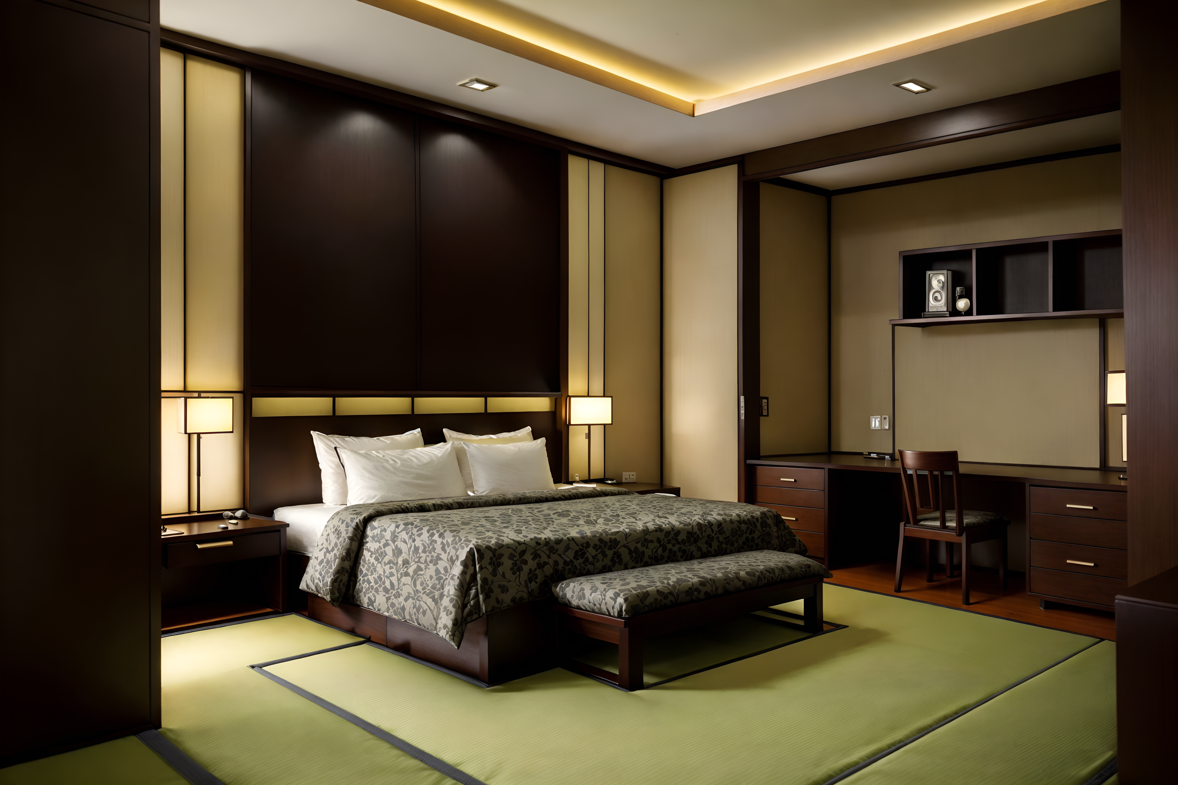 japanese design hotel roomsinterior decorate this hotel room with japanese design style. . . with plant and dresser closet and night light and headboard and working desk with desk chair and mirror and bedside table or night stand and storage bench or ottoman. . with tatami mats and low furniture and tranquility and bamboo accents and natural materials and neutral colors and wabi-sabi and minimalism. . .