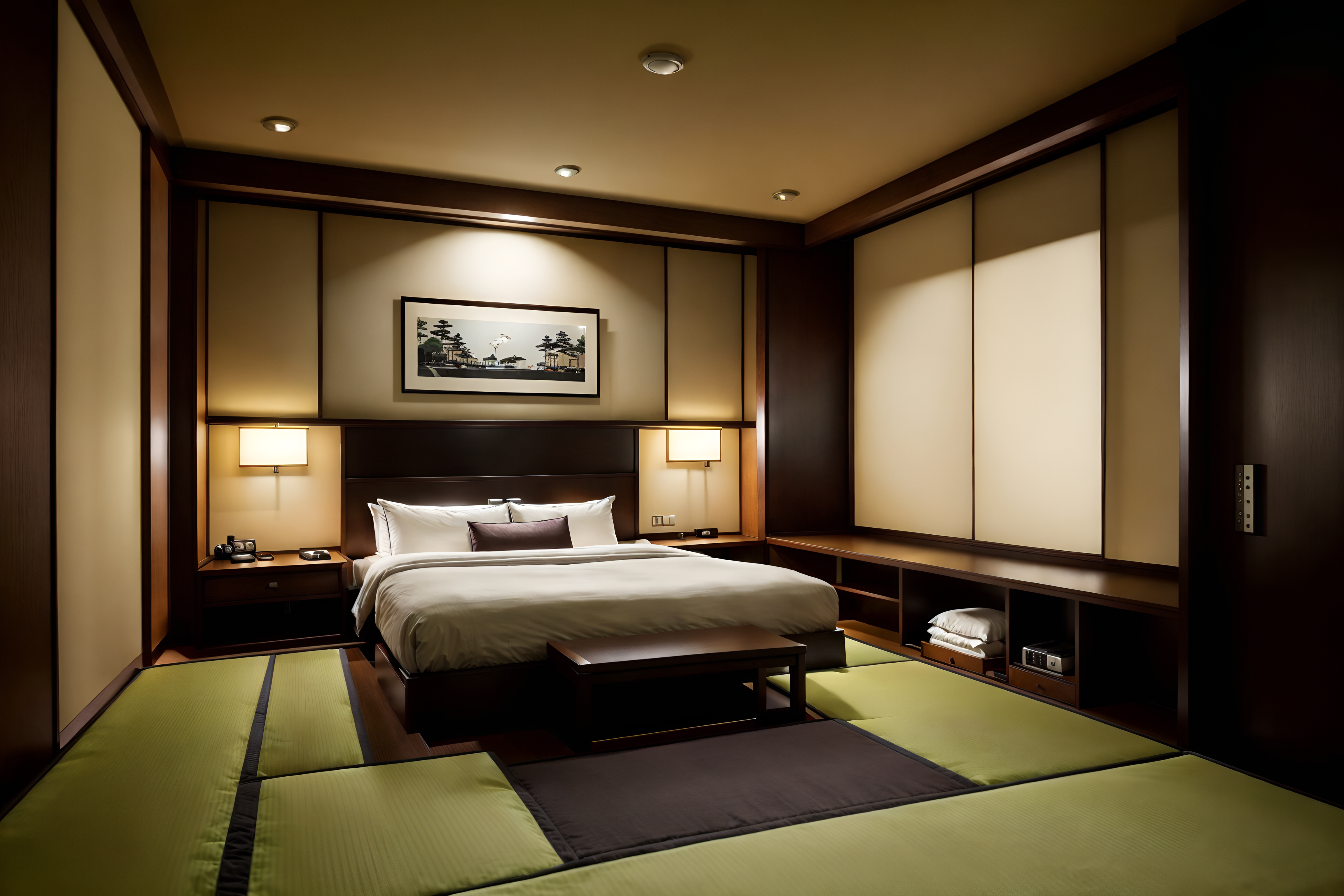 japanese design hotel roomsinterior decorate this hotel room with japanese design style. . . with plant and dresser closet and night light and headboard and working desk with desk chair and mirror and bedside table or night stand and storage bench or ottoman. . with tatami mats and low furniture and tranquility and bamboo accents and natural materials and neutral colors and wabi-sabi and minimalism. . .