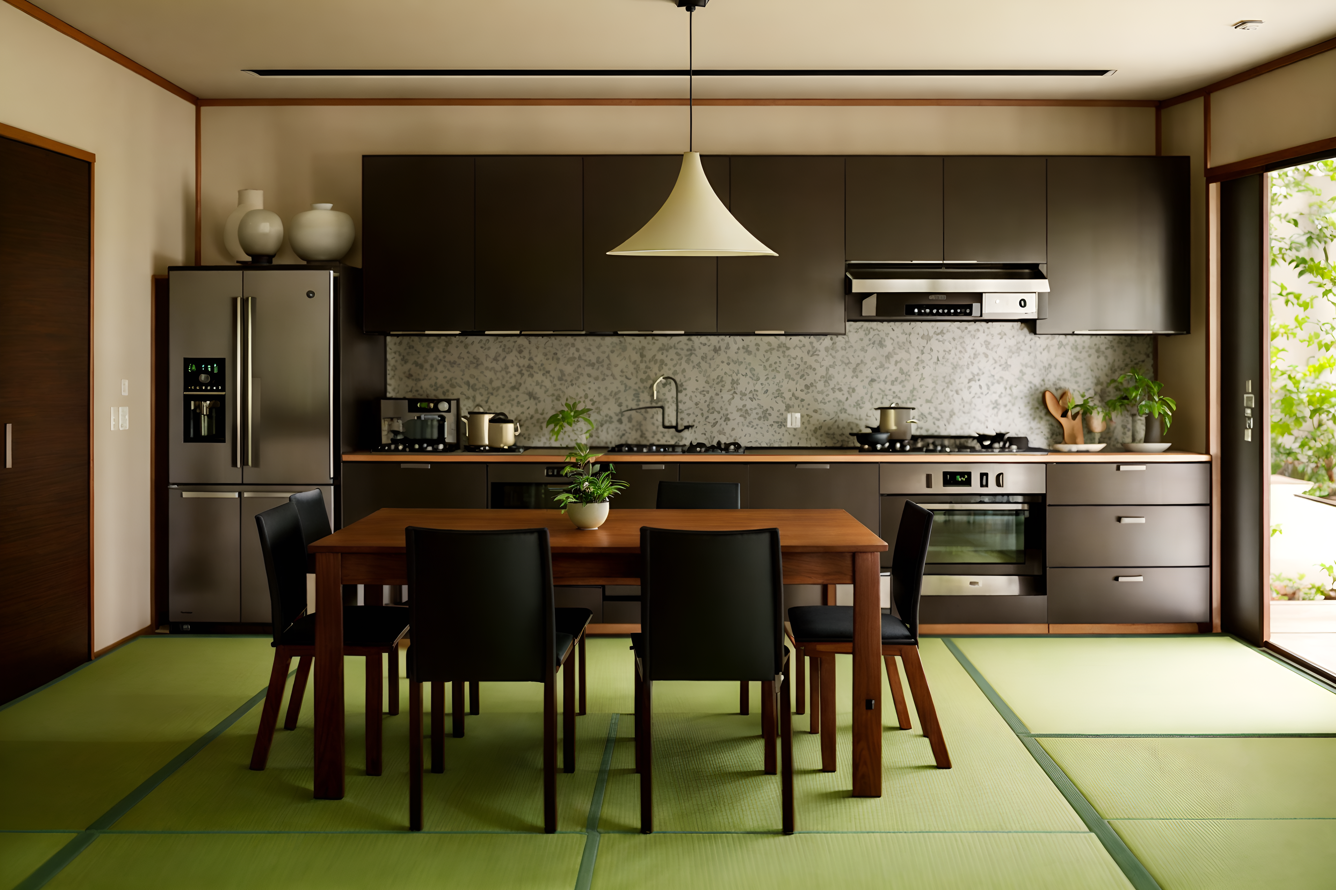 photo from pinterest of japanese design-style interior designed (kitchen living combo interior) with chairs and plant and refrigerator and coffee tables and sofa and bookshelves and plant and kitchen cabinets. . with . . cinematic photo, highly detailed, cinematic lighting, ultra-detailed, ultrarealistic, photorealism, 8k. trending on pinterest. japanese design interior design style. masterpiece, cinematic light, ultrarealistic+, photorealistic+, 8k, raw photo, realistic, sharp focus on eyes, (symmetrical eyes), (intact eyes), hyperrealistic, highest quality, best quality, , highly detailed, masterpiece, best quality, extremely detailed 8k wallpaper, masterpiece, best quality, ultra-detailed, best shadow, detailed background, detailed face, detailed eyes, high contrast, best illumination, detailed face, dulux, caustic, dynamic angle, detailed glow. dramatic lighting. highly detailed, insanely detailed hair, symmetrical, intricate details, professionally retouched, 8k high definition. strong bokeh. award winning photo.