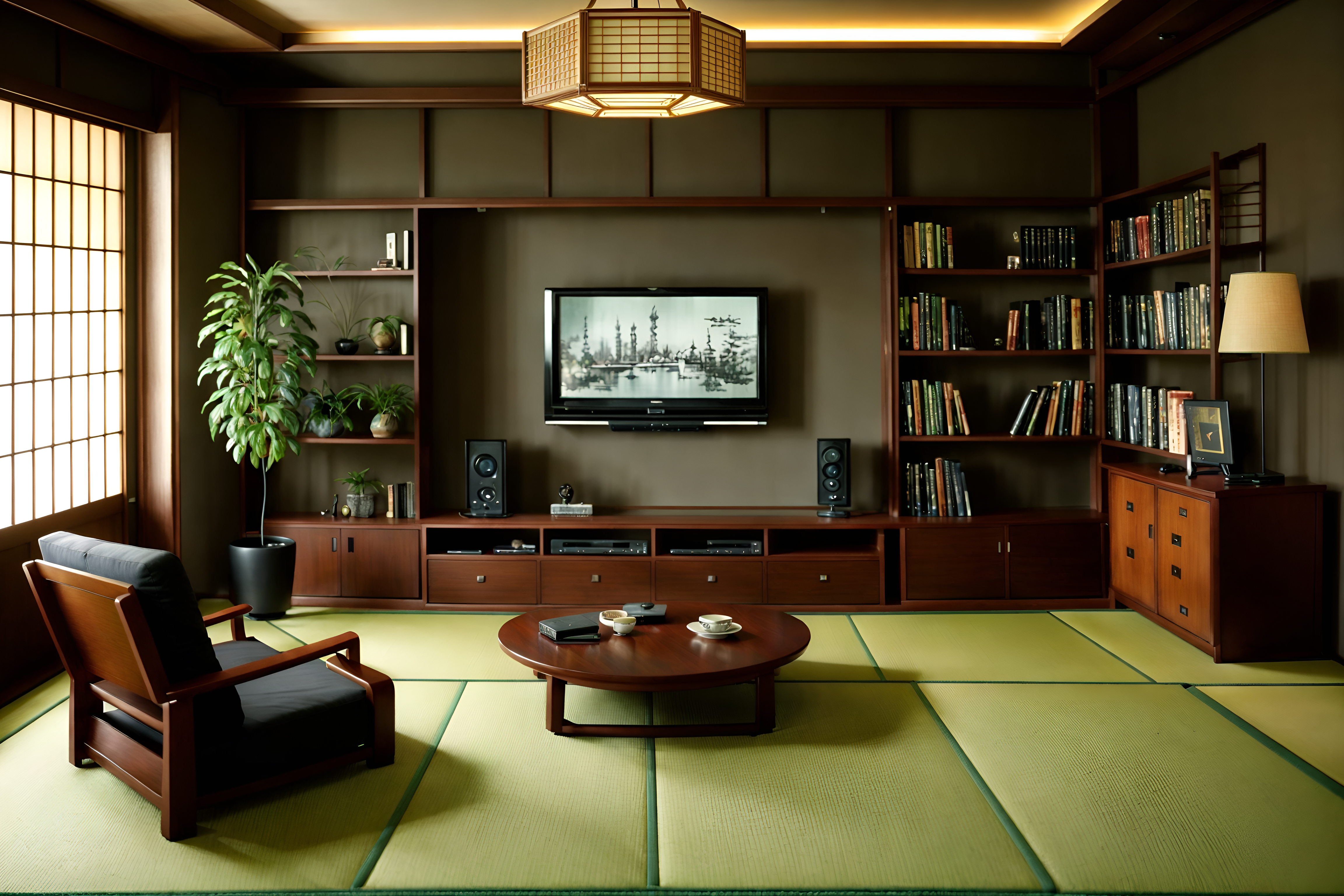 photo from pinterest of japanese design-style interior designed (living room interior) with bookshelves and televisions and chairs and electric lamps and sofa and occasional tables and plant and furniture. . with . . cinematic photo, highly detailed, cinematic lighting, ultra-detailed, ultrarealistic, photorealism, 8k. trending on pinterest. japanese design interior design style. masterpiece, cinematic light, ultrarealistic+, photorealistic+, 8k, raw photo, realistic, sharp focus on eyes, (symmetrical eyes), (intact eyes), hyperrealistic, highest quality, best quality, , highly detailed, masterpiece, best quality, extremely detailed 8k wallpaper, masterpiece, best quality, ultra-detailed, best shadow, detailed background, detailed face, detailed eyes, high contrast, best illumination, detailed face, dulux, caustic, dynamic angle, detailed glow. dramatic lighting. highly detailed, insanely detailed hair, symmetrical, intricate details, professionally retouched, 8k high definition. strong bokeh. award winning photo.
