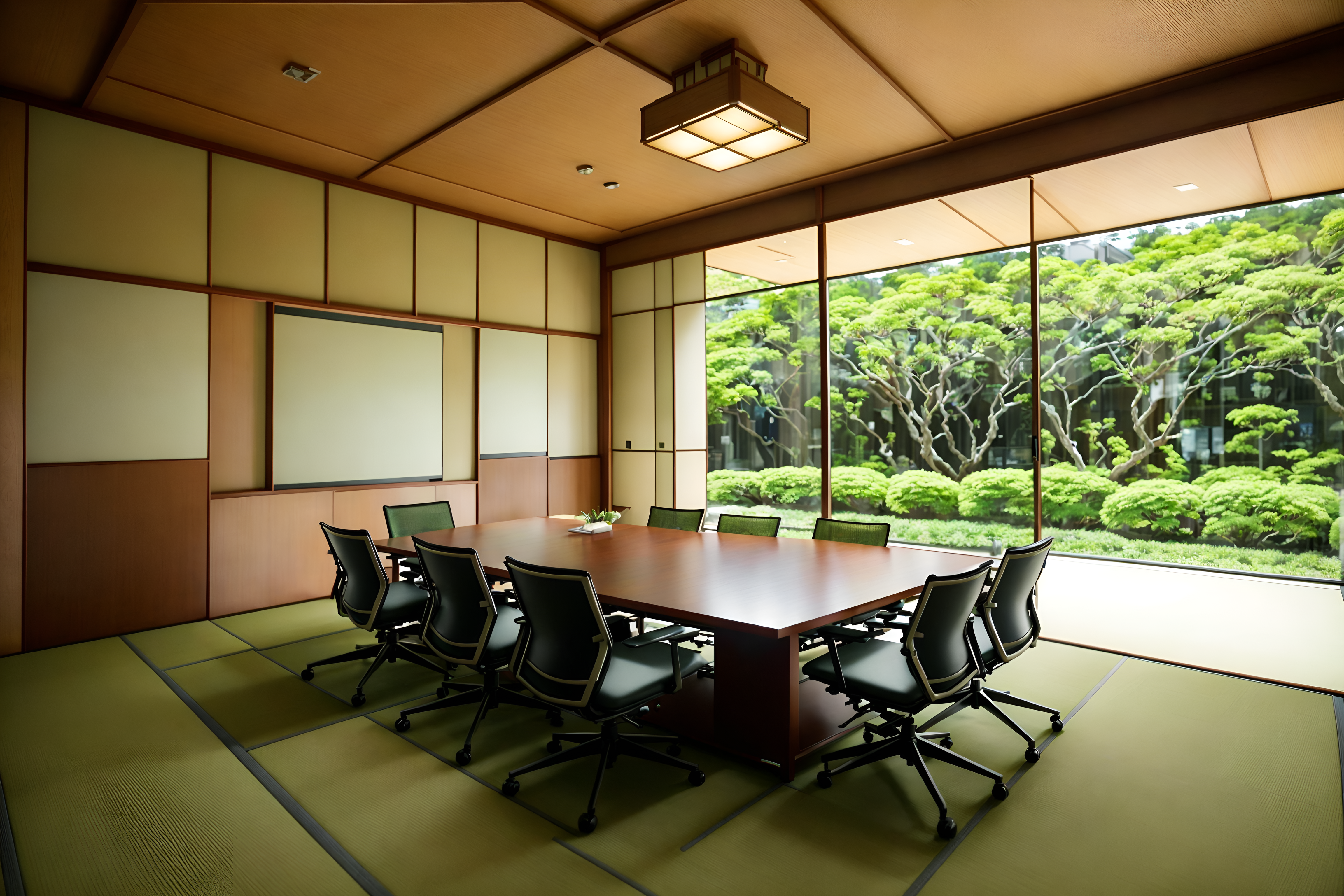 japanese design meeting roomsinterior decorate this meeting room with japanese design style. . . with glass doors and boardroom table and vase and plant and office chairs and cabinets and glass walls and painting or photo on wall. . with tranquility and indoor plants and bamboo accents and minimalism and neutral colors and wabi-sabi and natural materials and tatami mats. . .