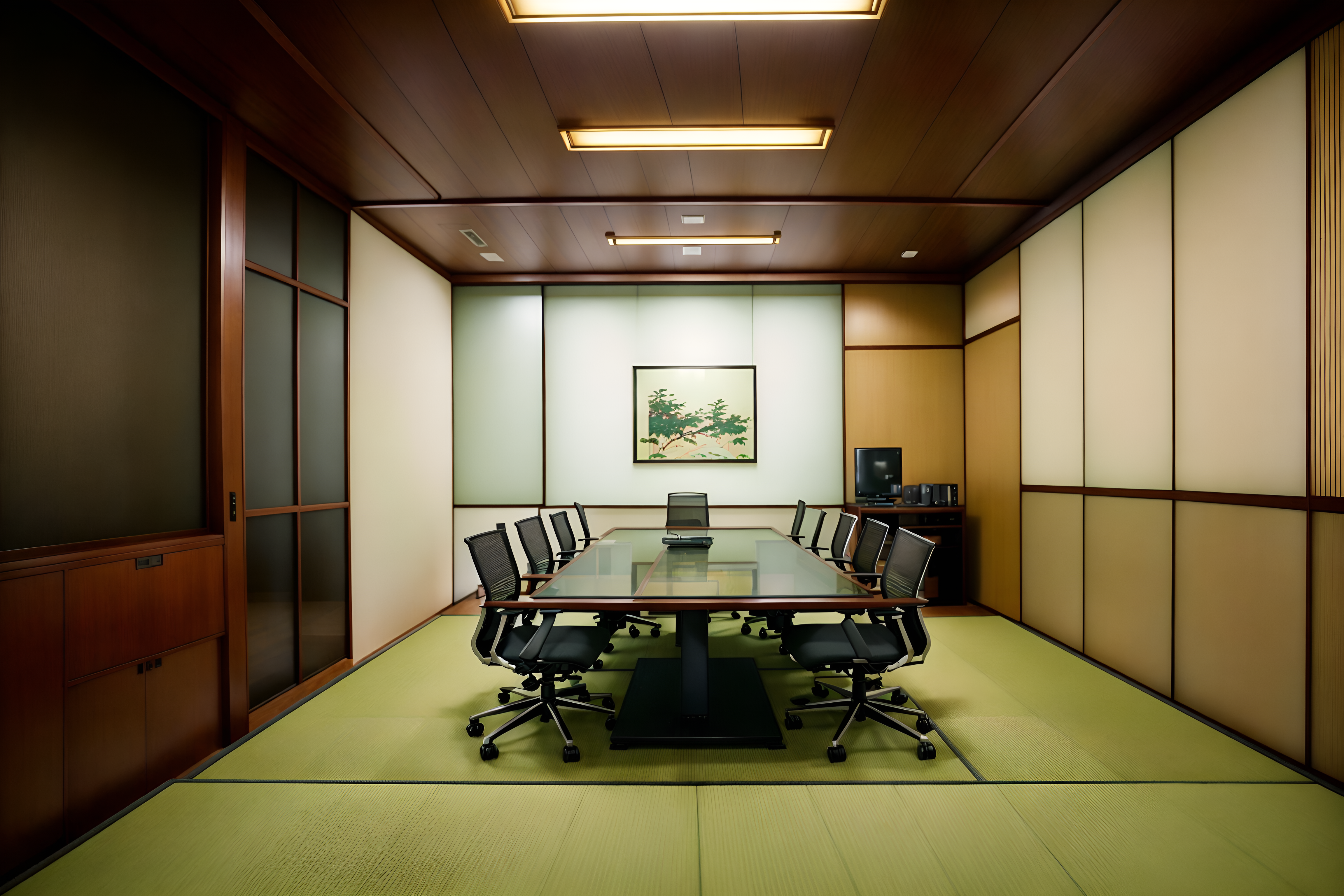 photo from pinterest of japanese design-style interior designed (meeting room interior) with cabinets and office chairs and painting or photo on wall and glass doors and boardroom table and glass walls and plant and vase. . with . . cinematic photo, highly detailed, cinematic lighting, ultra-detailed, ultrarealistic, photorealism, 8k. trending on pinterest. japanese design interior design style. masterpiece, cinematic light, ultrarealistic+, photorealistic+, 8k, raw photo, realistic, sharp focus on eyes, (symmetrical eyes), (intact eyes), hyperrealistic, highest quality, best quality, , highly detailed, masterpiece, best quality, extremely detailed 8k wallpaper, masterpiece, best quality, ultra-detailed, best shadow, detailed background, detailed face, detailed eyes, high contrast, best illumination, detailed face, dulux, caustic, dynamic angle, detailed glow. dramatic lighting. highly detailed, insanely detailed hair, symmetrical, intricate details, professionally retouched, 8k high definition. strong bokeh. award winning photo.