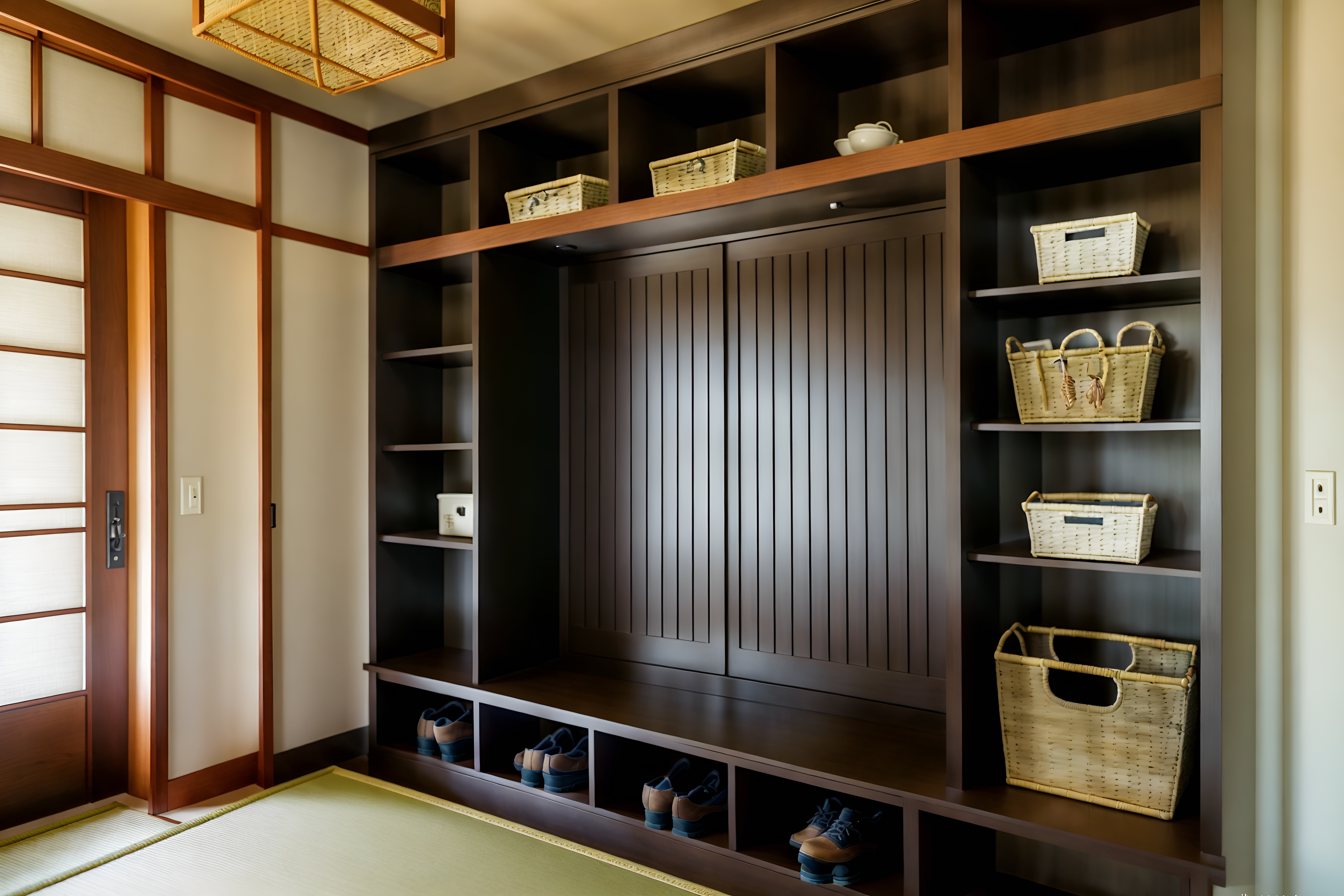 japanese design mudroomsinterior decorate this mudroom with japanese design style. . . with cabinets and storage baskets and cubbies and wall hooks for coats and storage drawers and high up storage and a bench and shelves for shoes. . with zen decor and wabi-sabi and tatami mats and minimalism and indoor plants and tranquility and natural materials and neutral colors. . .
