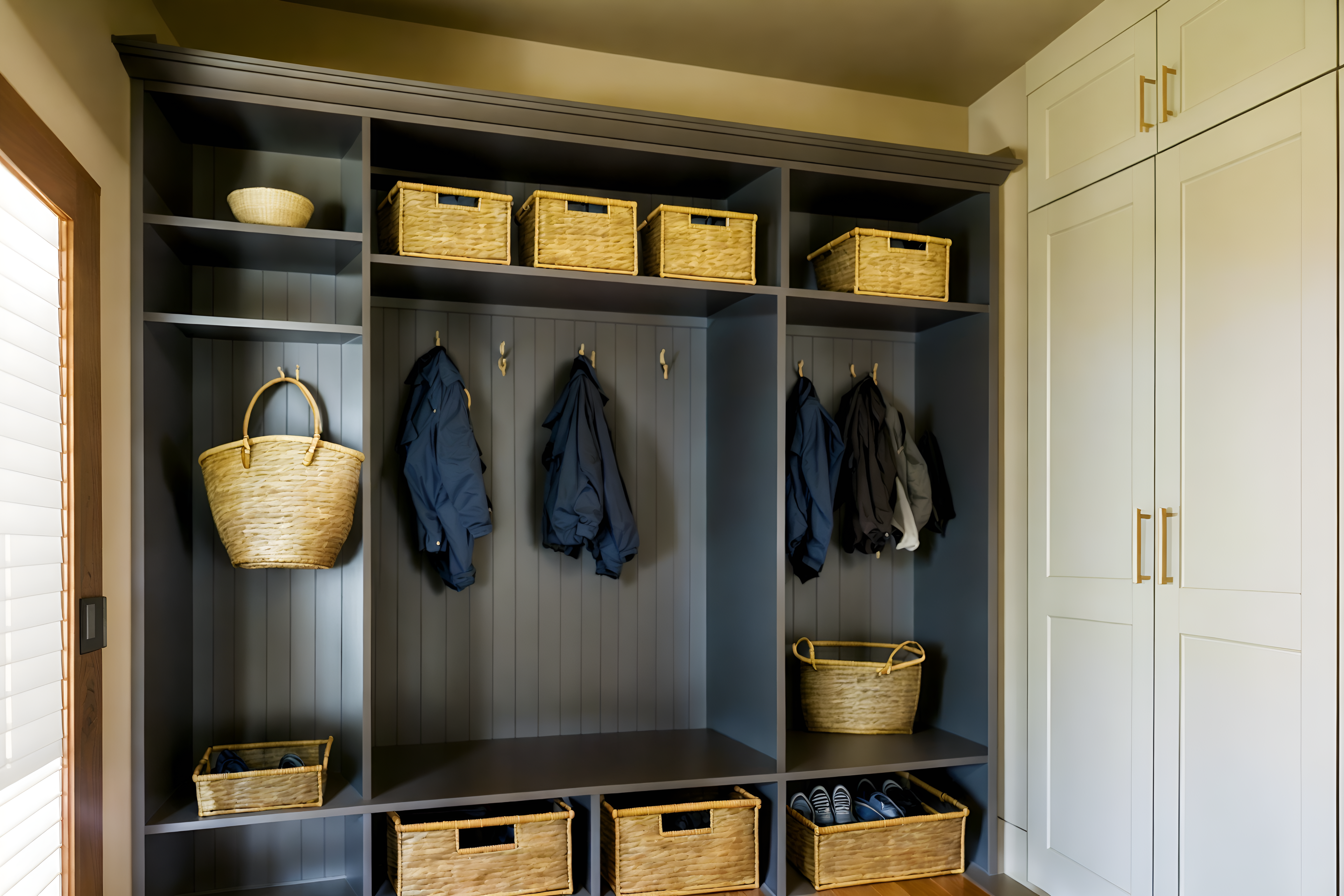 photo from pinterest of japanese design-style interior designed (mudroom interior) with storage baskets and a bench and cabinets and wall hooks for coats and storage drawers and shelves for shoes and cubbies and high up storage. . with . . cinematic photo, highly detailed, cinematic lighting, ultra-detailed, ultrarealistic, photorealism, 8k. trending on pinterest. japanese design interior design style. masterpiece, cinematic light, ultrarealistic+, photorealistic+, 8k, raw photo, realistic, sharp focus on eyes, (symmetrical eyes), (intact eyes), hyperrealistic, highest quality, best quality, , highly detailed, masterpiece, best quality, extremely detailed 8k wallpaper, masterpiece, best quality, ultra-detailed, best shadow, detailed background, detailed face, detailed eyes, high contrast, best illumination, detailed face, dulux, caustic, dynamic angle, detailed glow. dramatic lighting. highly detailed, insanely detailed hair, symmetrical, intricate details, professionally retouched, 8k high definition. strong bokeh. award winning photo.
