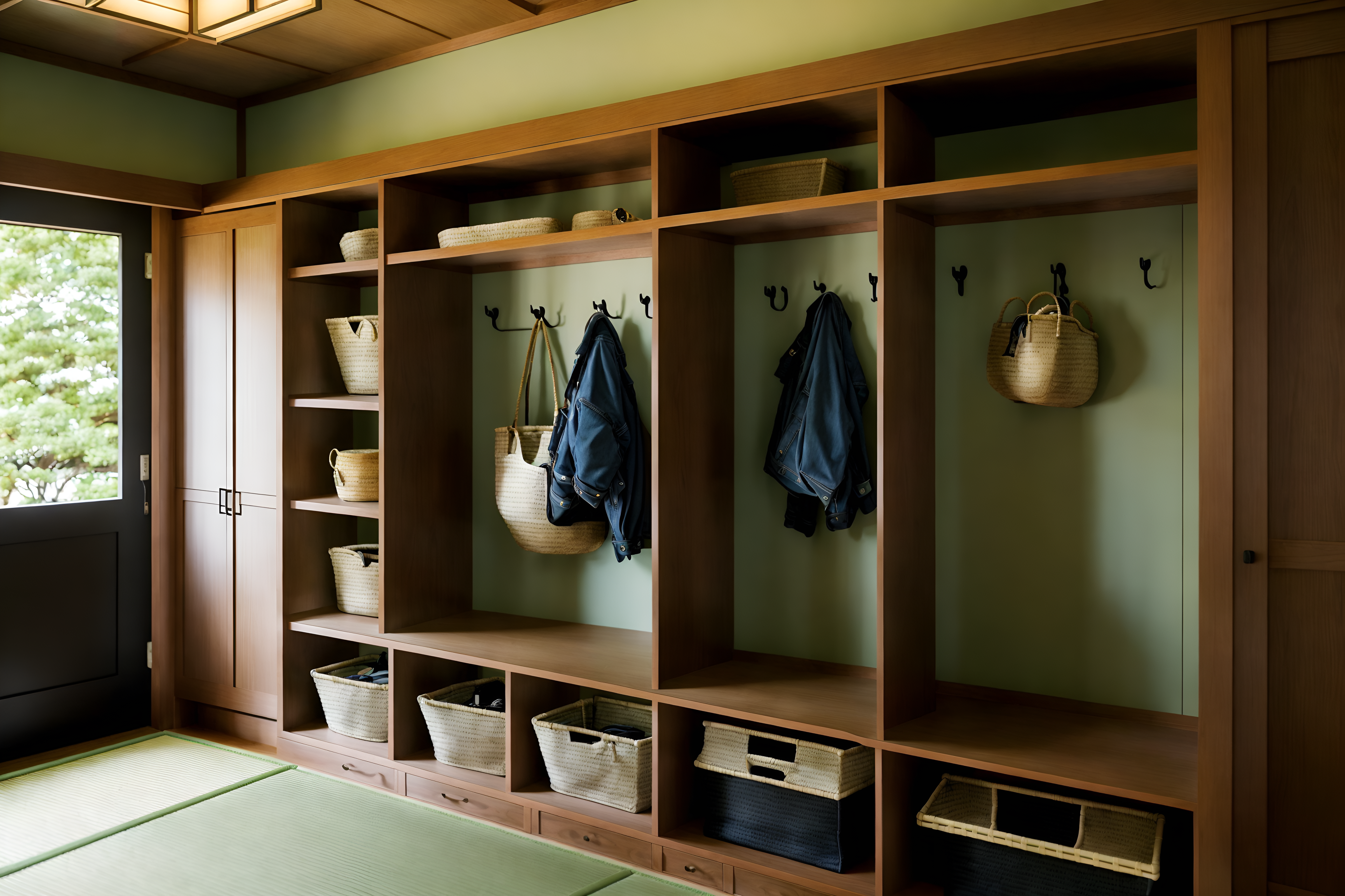 photo from pinterest of japanese design-style interior designed (mudroom interior) with storage baskets and a bench and cabinets and wall hooks for coats and storage drawers and shelves for shoes and cubbies and high up storage. . with . . cinematic photo, highly detailed, cinematic lighting, ultra-detailed, ultrarealistic, photorealism, 8k. trending on pinterest. japanese design interior design style. masterpiece, cinematic light, ultrarealistic+, photorealistic+, 8k, raw photo, realistic, sharp focus on eyes, (symmetrical eyes), (intact eyes), hyperrealistic, highest quality, best quality, , highly detailed, masterpiece, best quality, extremely detailed 8k wallpaper, masterpiece, best quality, ultra-detailed, best shadow, detailed background, detailed face, detailed eyes, high contrast, best illumination, detailed face, dulux, caustic, dynamic angle, detailed glow. dramatic lighting. highly detailed, insanely detailed hair, symmetrical, intricate details, professionally retouched, 8k high definition. strong bokeh. award winning photo.