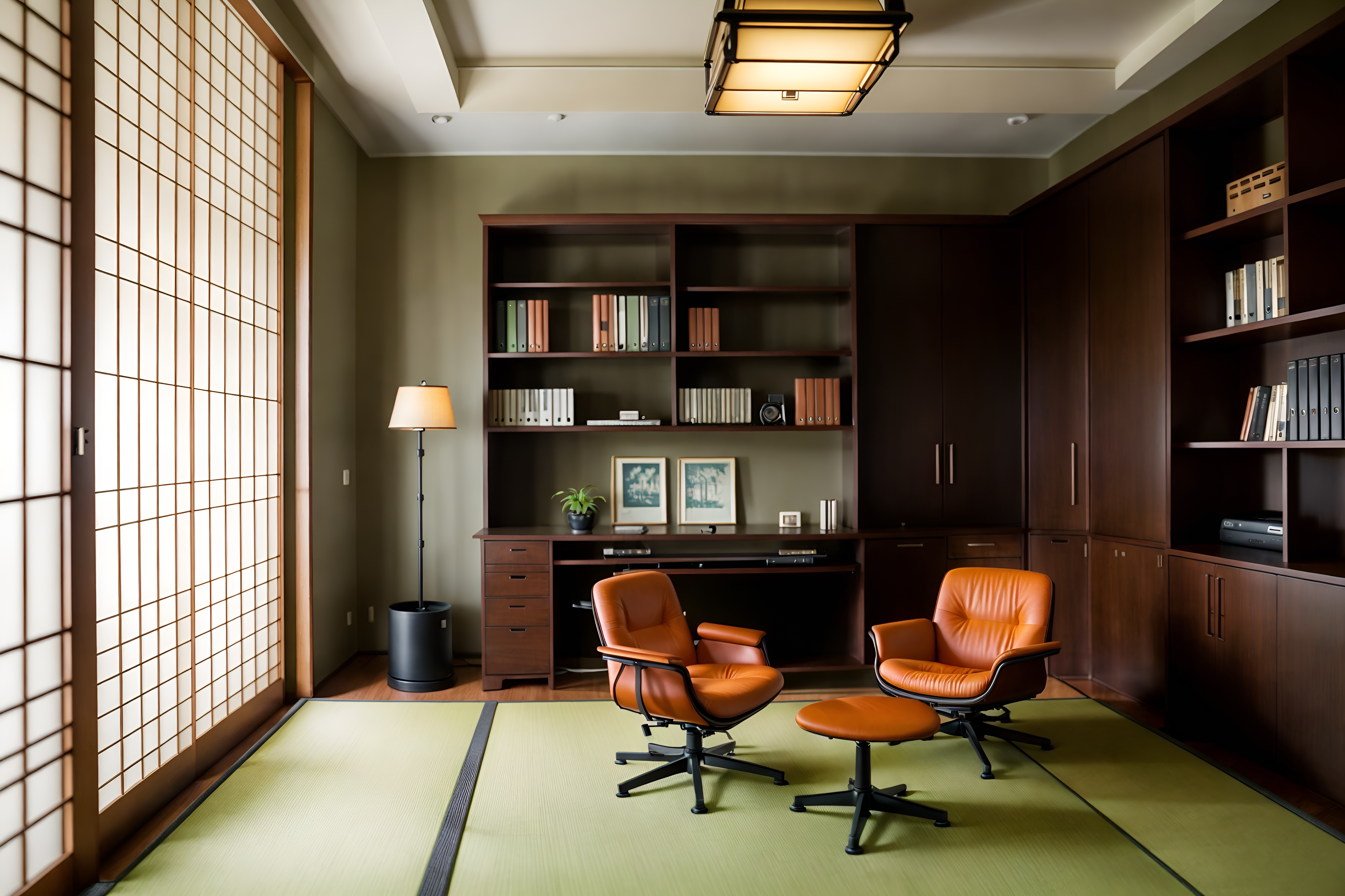 photo from pinterest of japanese design-style interior designed (study room interior) with office chair and lounge chair and desk lamp and cabinets and writing desk and bookshelves and plant and office chair. . with . . cinematic photo, highly detailed, cinematic lighting, ultra-detailed, ultrarealistic, photorealism, 8k. trending on pinterest. japanese design interior design style. masterpiece, cinematic light, ultrarealistic+, photorealistic+, 8k, raw photo, realistic, sharp focus on eyes, (symmetrical eyes), (intact eyes), hyperrealistic, highest quality, best quality, , highly detailed, masterpiece, best quality, extremely detailed 8k wallpaper, masterpiece, best quality, ultra-detailed, best shadow, detailed background, detailed face, detailed eyes, high contrast, best illumination, detailed face, dulux, caustic, dynamic angle, detailed glow. dramatic lighting. highly detailed, insanely detailed hair, symmetrical, intricate details, professionally retouched, 8k high definition. strong bokeh. award winning photo.