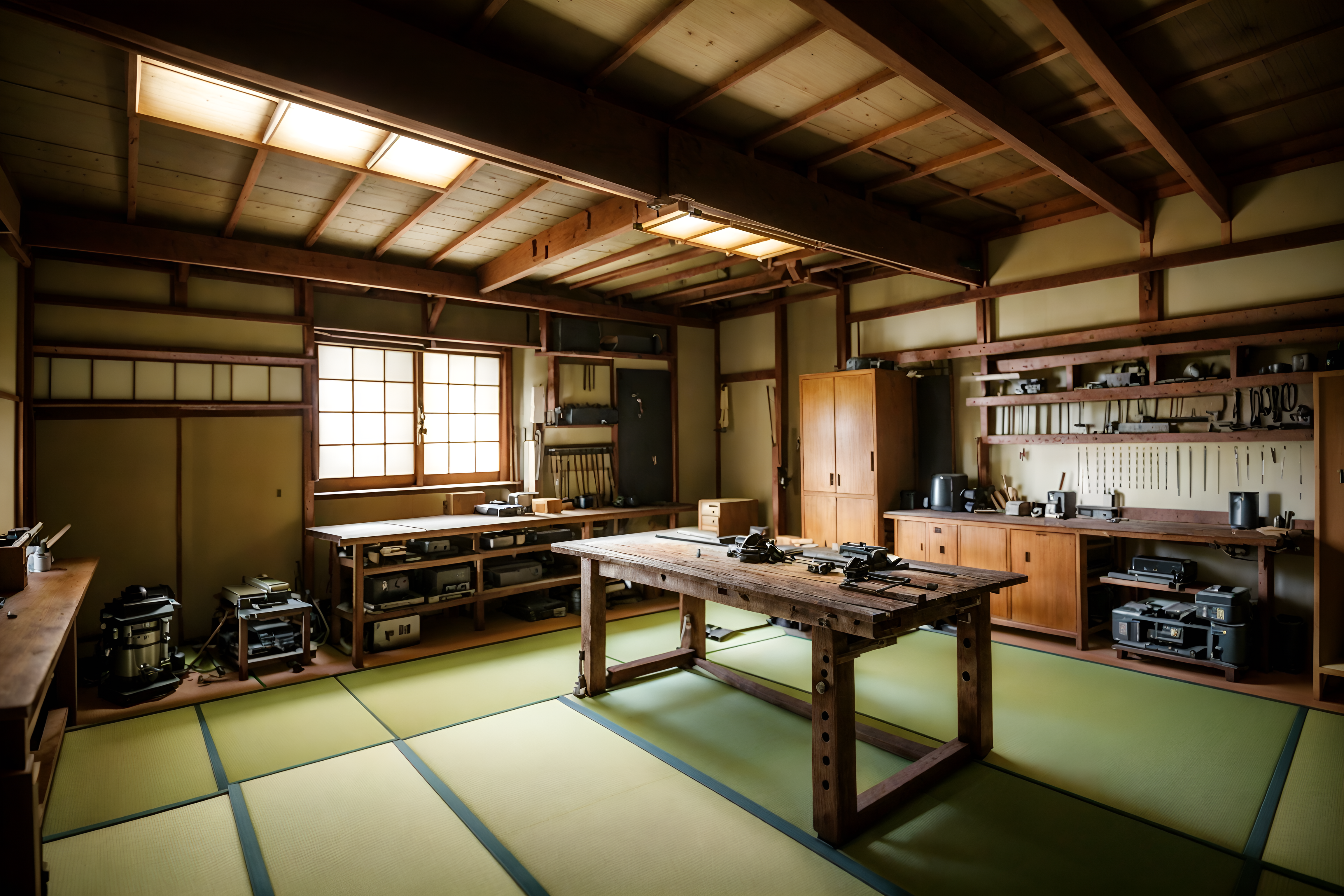 photo from pinterest of japanese design-style interior designed (workshop interior) with wooden workbench and tool wall and messy and wooden workbench. . with . . cinematic photo, highly detailed, cinematic lighting, ultra-detailed, ultrarealistic, photorealism, 8k. trending on pinterest. japanese design interior design style. masterpiece, cinematic light, ultrarealistic+, photorealistic+, 8k, raw photo, realistic, sharp focus on eyes, (symmetrical eyes), (intact eyes), hyperrealistic, highest quality, best quality, , highly detailed, masterpiece, best quality, extremely detailed 8k wallpaper, masterpiece, best quality, ultra-detailed, best shadow, detailed background, detailed face, detailed eyes, high contrast, best illumination, detailed face, dulux, caustic, dynamic angle, detailed glow. dramatic lighting. highly detailed, insanely detailed hair, symmetrical, intricate details, professionally retouched, 8k high definition. strong bokeh. award winning photo.