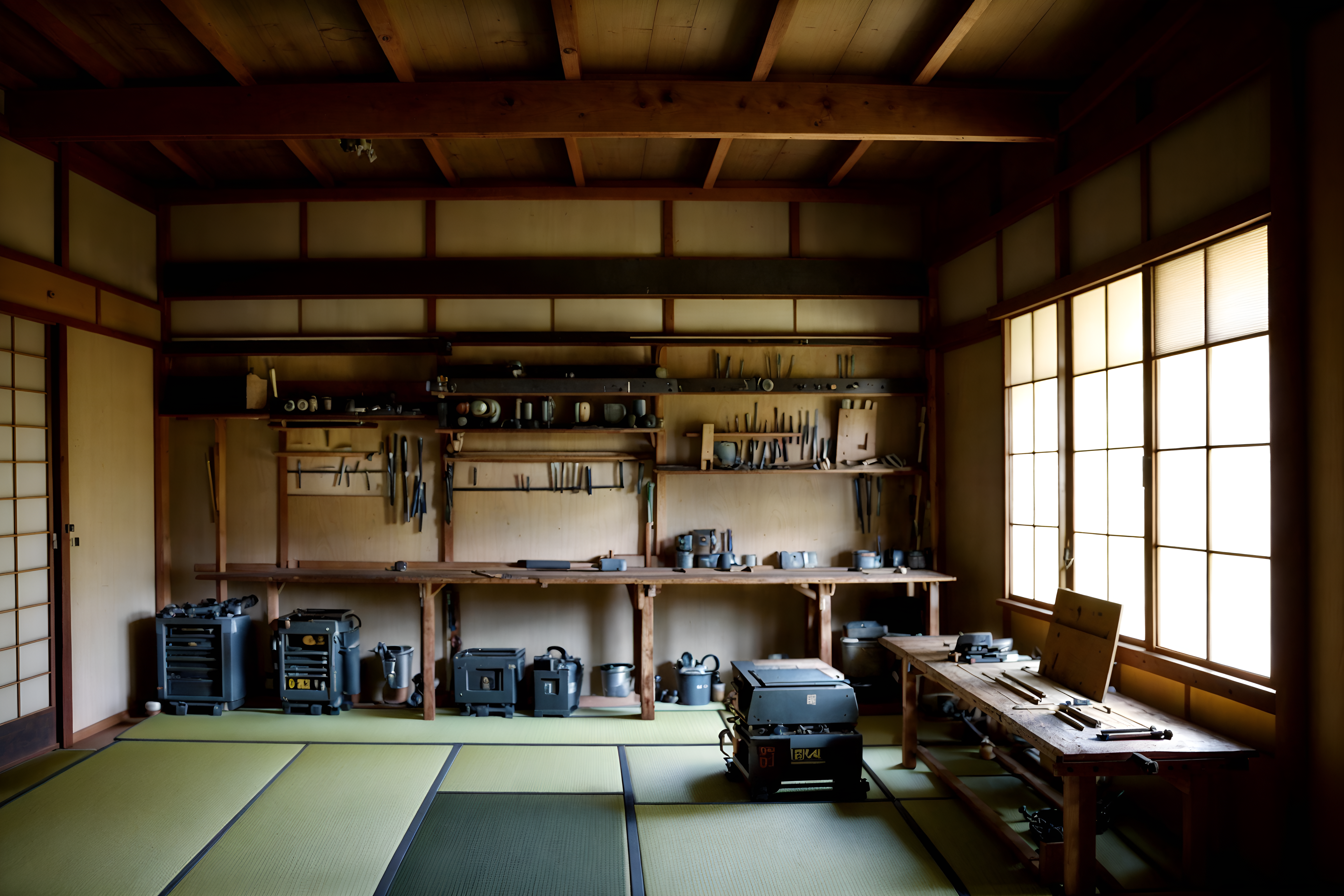 photo from pinterest of japanese design-style interior designed (workshop interior) with wooden workbench and tool wall and messy and wooden workbench. . with . . cinematic photo, highly detailed, cinematic lighting, ultra-detailed, ultrarealistic, photorealism, 8k. trending on pinterest. japanese design interior design style. masterpiece, cinematic light, ultrarealistic+, photorealistic+, 8k, raw photo, realistic, sharp focus on eyes, (symmetrical eyes), (intact eyes), hyperrealistic, highest quality, best quality, , highly detailed, masterpiece, best quality, extremely detailed 8k wallpaper, masterpiece, best quality, ultra-detailed, best shadow, detailed background, detailed face, detailed eyes, high contrast, best illumination, detailed face, dulux, caustic, dynamic angle, detailed glow. dramatic lighting. highly detailed, insanely detailed hair, symmetrical, intricate details, professionally retouched, 8k high definition. strong bokeh. award winning photo.