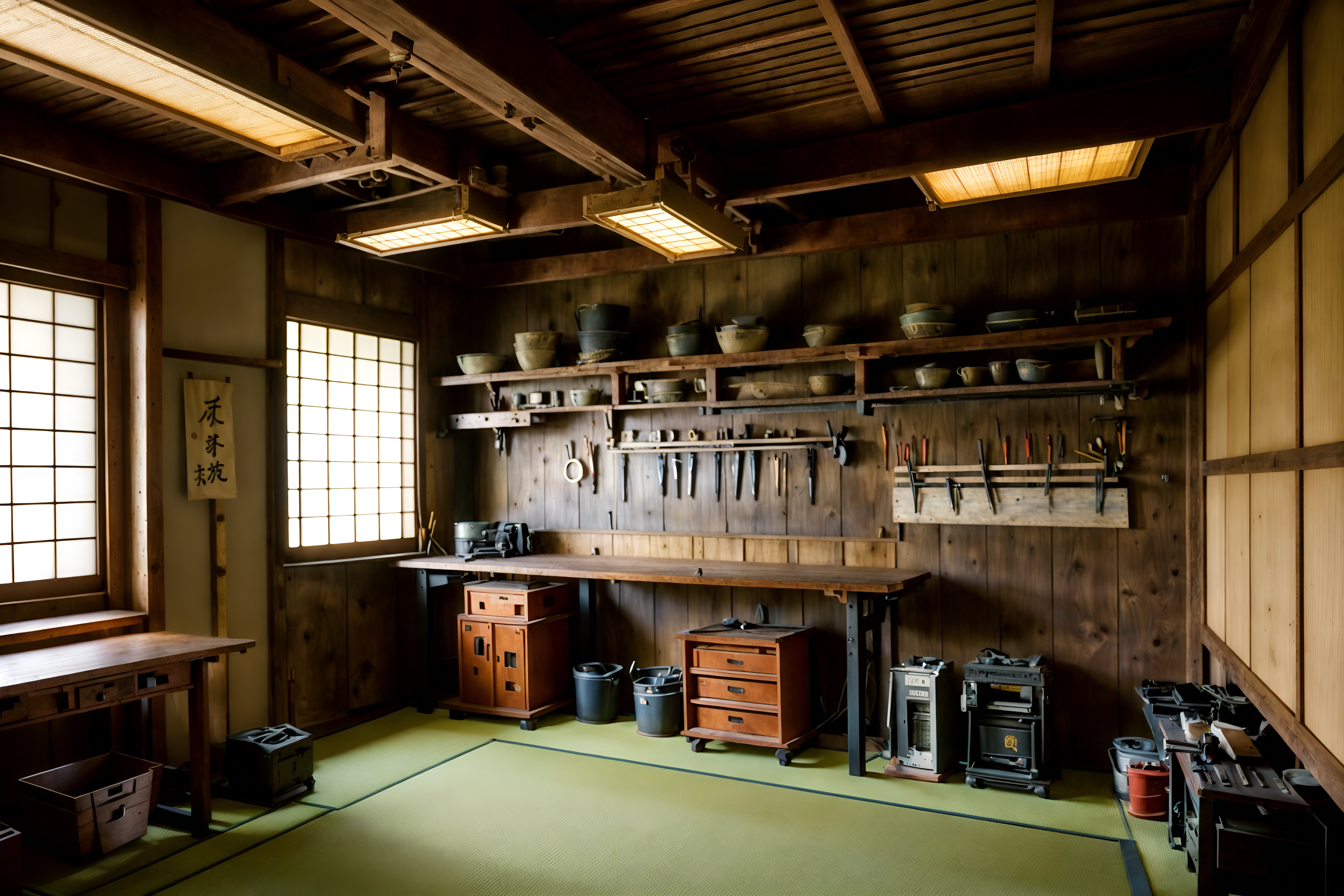 photo from pinterest of japanese design-style interior designed (workshop interior) with wooden workbench and tool wall and messy and wooden workbench. . with . . cinematic photo, highly detailed, cinematic lighting, ultra-detailed, ultrarealistic, photorealism, 8k. trending on pinterest. japanese design interior design style. masterpiece, cinematic light, ultrarealistic+, photorealistic+, 8k, raw photo, realistic, sharp focus on eyes, (symmetrical eyes), (intact eyes), hyperrealistic, highest quality, best quality, , highly detailed, masterpiece, best quality, extremely detailed 8k wallpaper, masterpiece, best quality, ultra-detailed, best shadow, detailed background, detailed face, detailed eyes, high contrast, best illumination, detailed face, dulux, caustic, dynamic angle, detailed glow. dramatic lighting. highly detailed, insanely detailed hair, symmetrical, intricate details, professionally retouched, 8k high definition. strong bokeh. award winning photo.