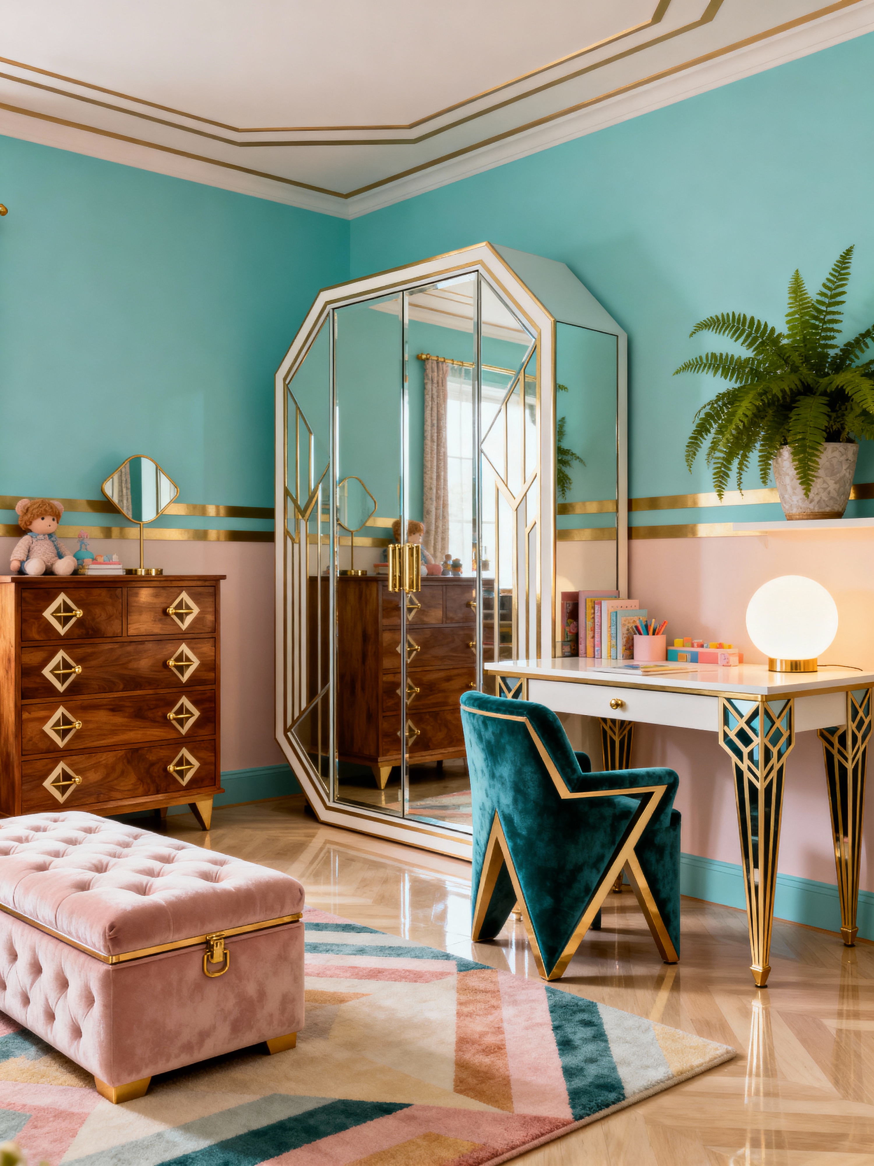 kids room with art deco style with dresser closet and kids desk and bed and storage bench or ottoman and plant and mirror and accent chair and night light. . with abstract patterns and angular shapes and glamour and symmetrical designs and bright and cheerful colors and exuberant shapes and bold geometry and luxury