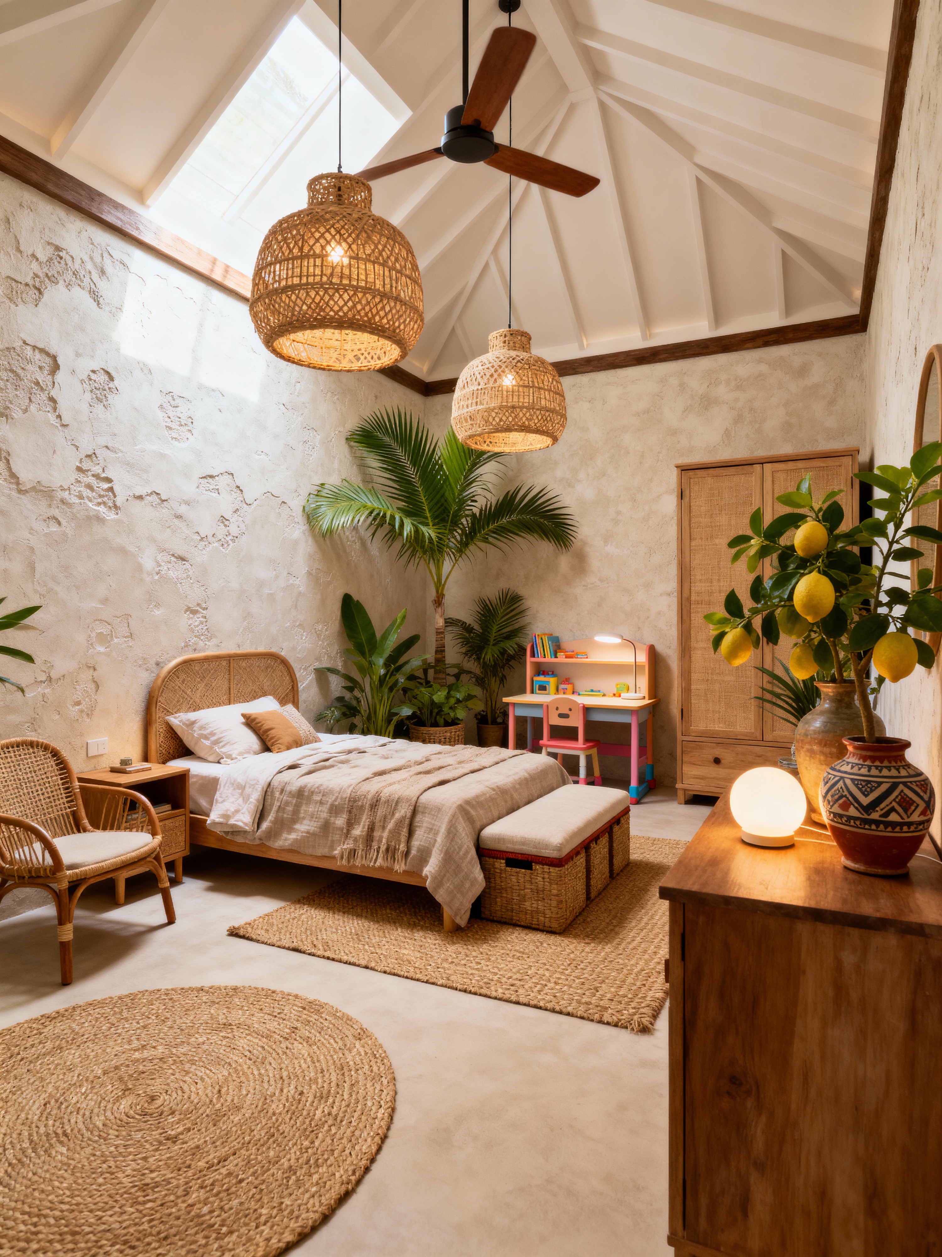 kids room with bali style with accent chair and storage bench or ottoman and bedside table or night stand and bed and plant and dresser closet and night light and kids desk. . with open high ceilings with fans and woven pendant lamps and handcrafted pottery and vases and lush tropical plants (palms, lemon trees) and textured plaster or stucco finish and linen or cotton fabrics and woven rugs (jute, seagrass) and modern boho chic