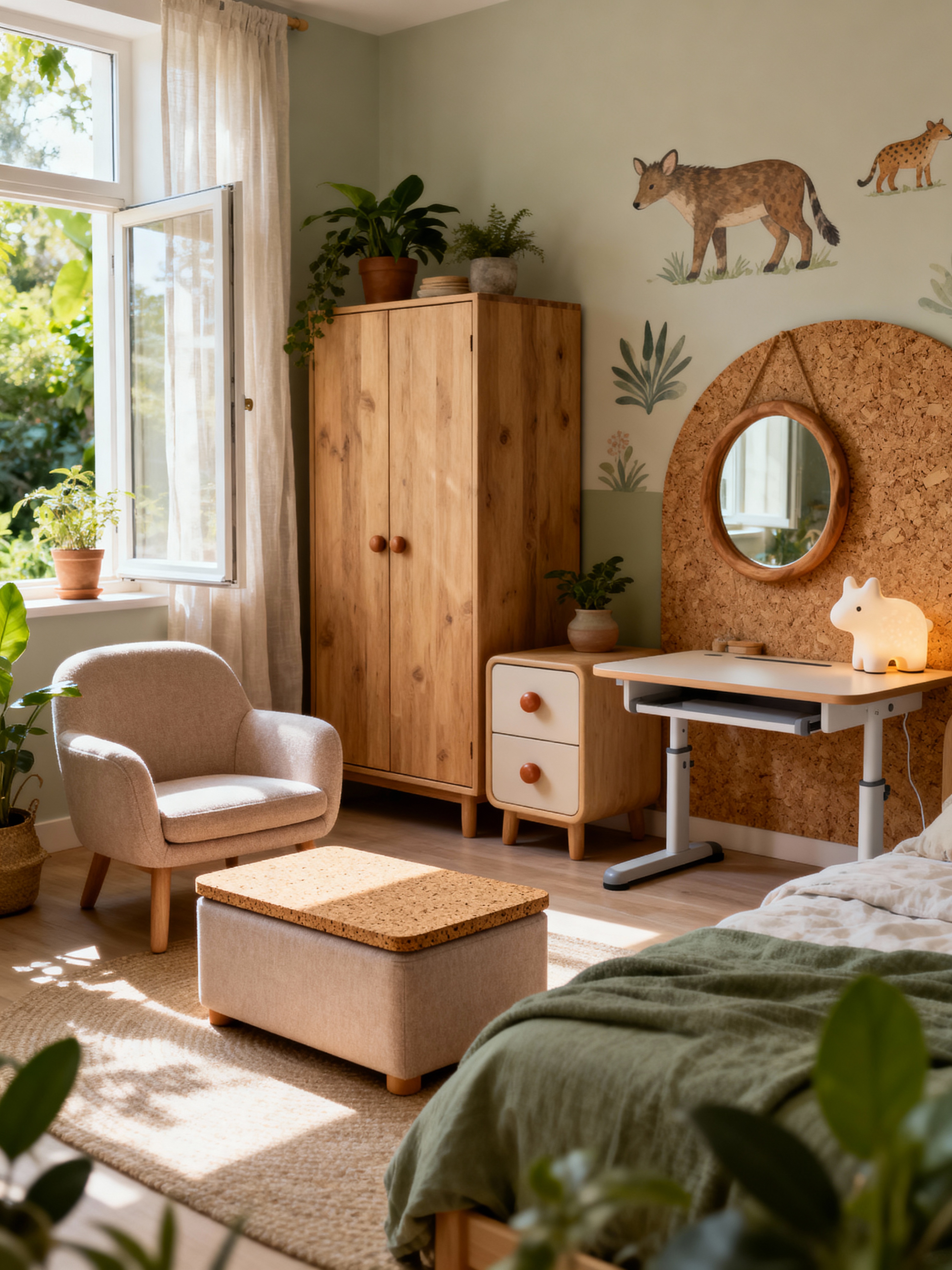 kids room with biophilic style with accent chair and storage bench or ottoman and dresser closet and bedside table or night stand and mirror and kids desk and headboard and night light. . with fresh air and natural environment and cork materials and natural elements and features of nature and ceramic materials and images of animals and sunlight