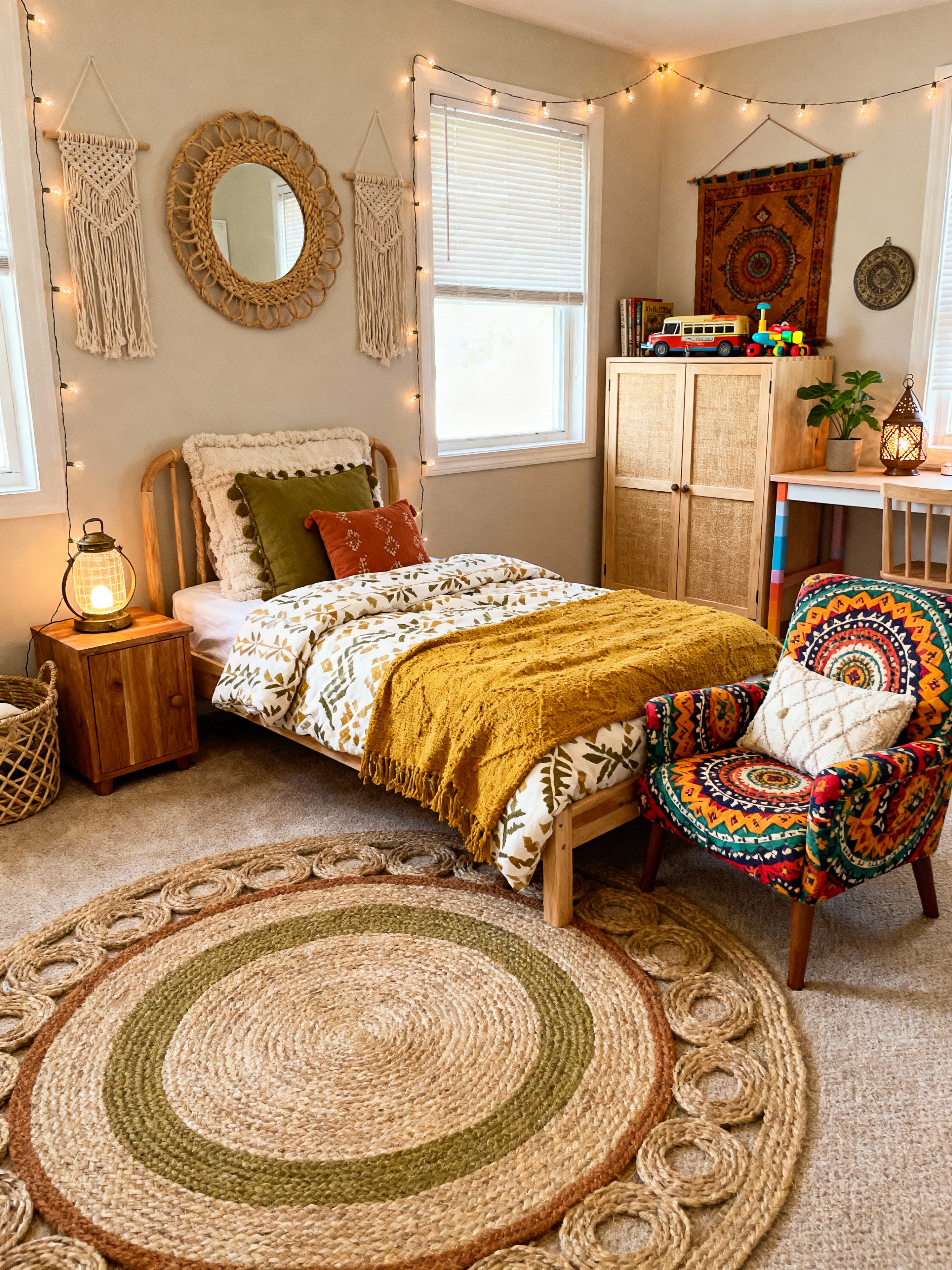 kids room with boho-chic style with plant and accent chair and bed and night light and mirror and bedside table or night stand and dresser closet and kids desk. . with bohemian flair and free-spirited and vintage finds and eclectic mix and layered textiles and natural materials and global artifacts and earthy colors