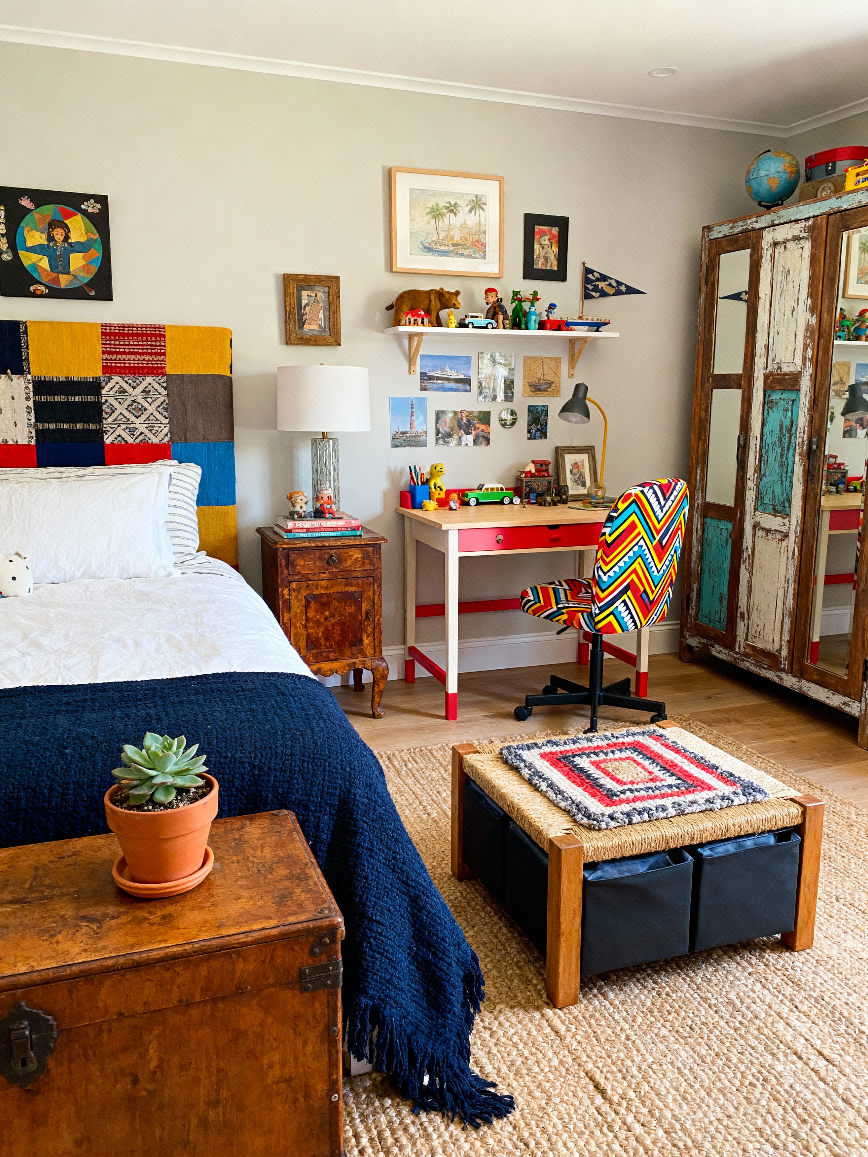kids room with eclectic style with bedside table or night stand and plant and bed and kids desk and accent chair and dresser closet and headboard and storage bench or ottoman. . with creative freedom and bold combinations and global influences and vintage finds and unique pieces and mixed styles and layered textures and personal expression