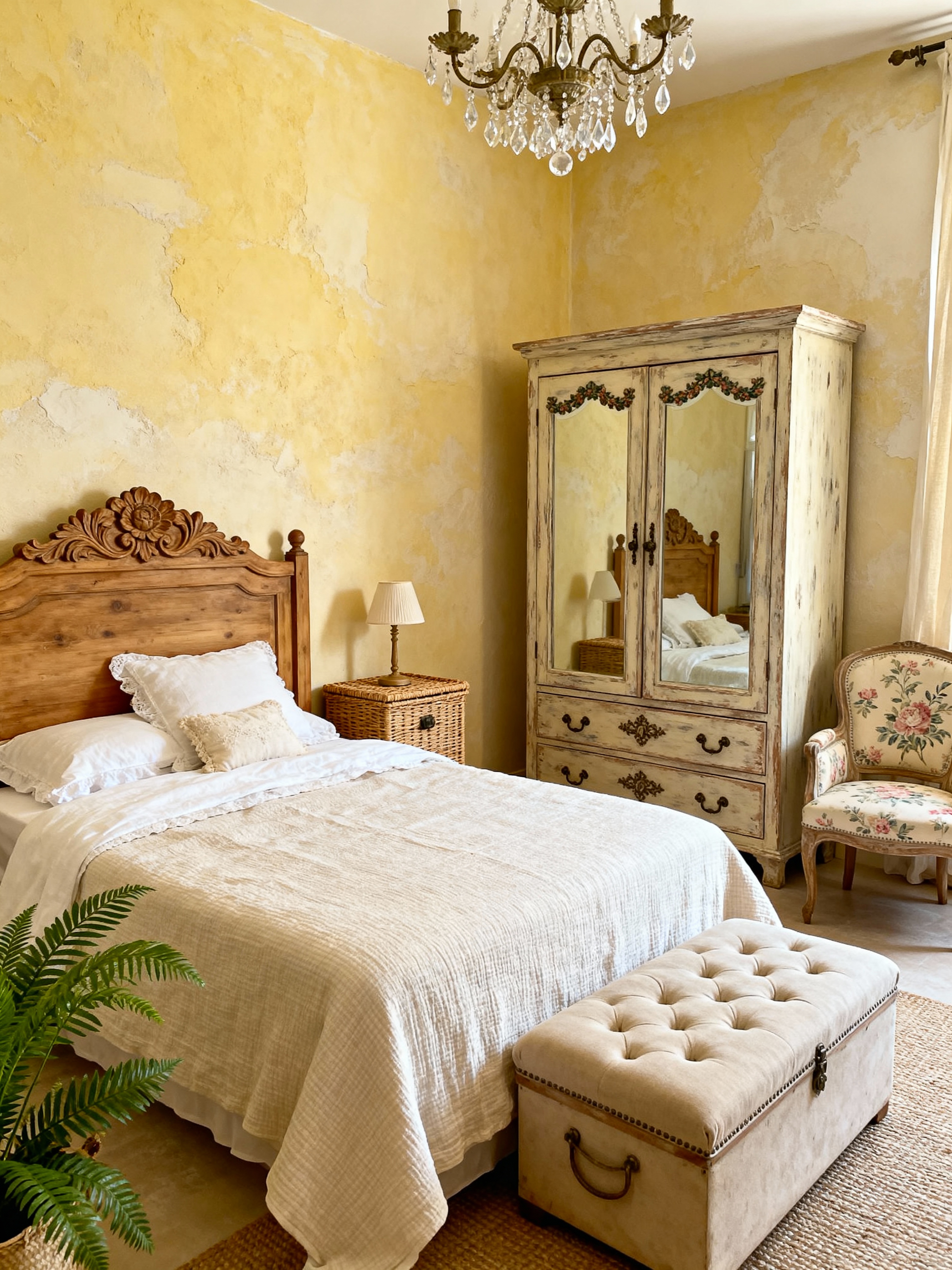 kids room with french country style with dresser closet and bedside table or night stand and plant and mirror and accent chair and storage bench or ottoman and bed and headboard. . with textured walls and distressed wood and warm tones and ornate details and country elegance and soft fabrics and elegant rustic and chandeliers
