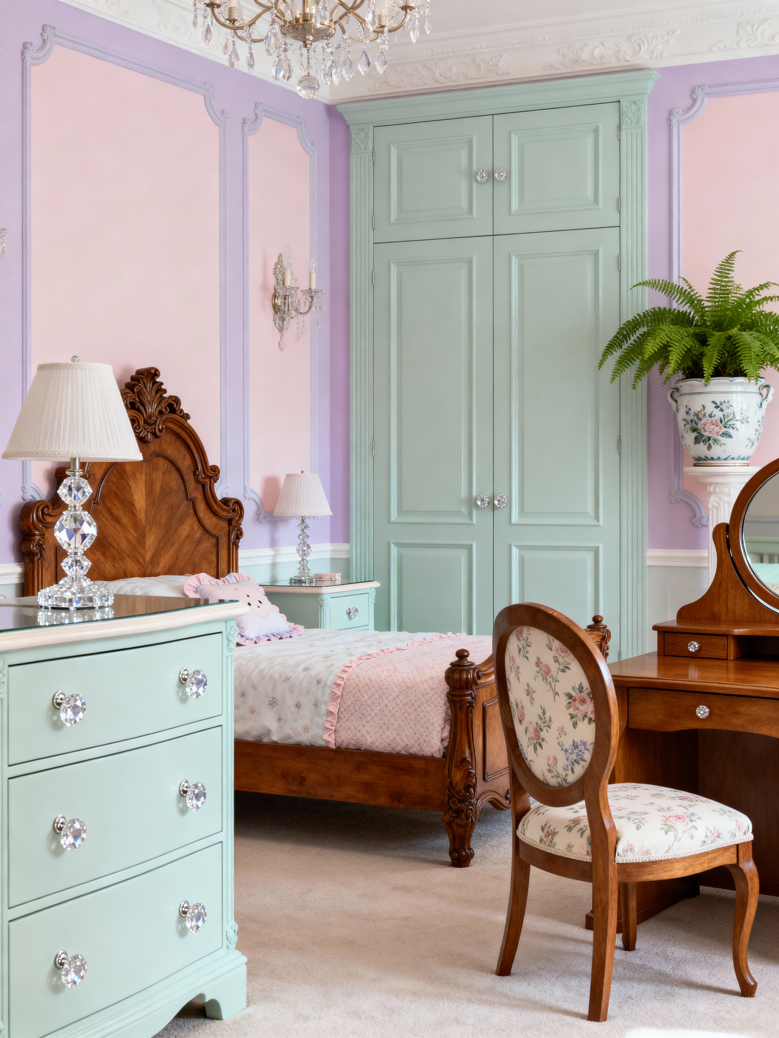 kids room with french style with mirror and headboard and night light and dresser closet and bed and kids desk and accent chair and plant. . with refined luxury and classic beauty and ornate furniture and soft pastels and romantic style and crystal accents and elegant details and provincial charm