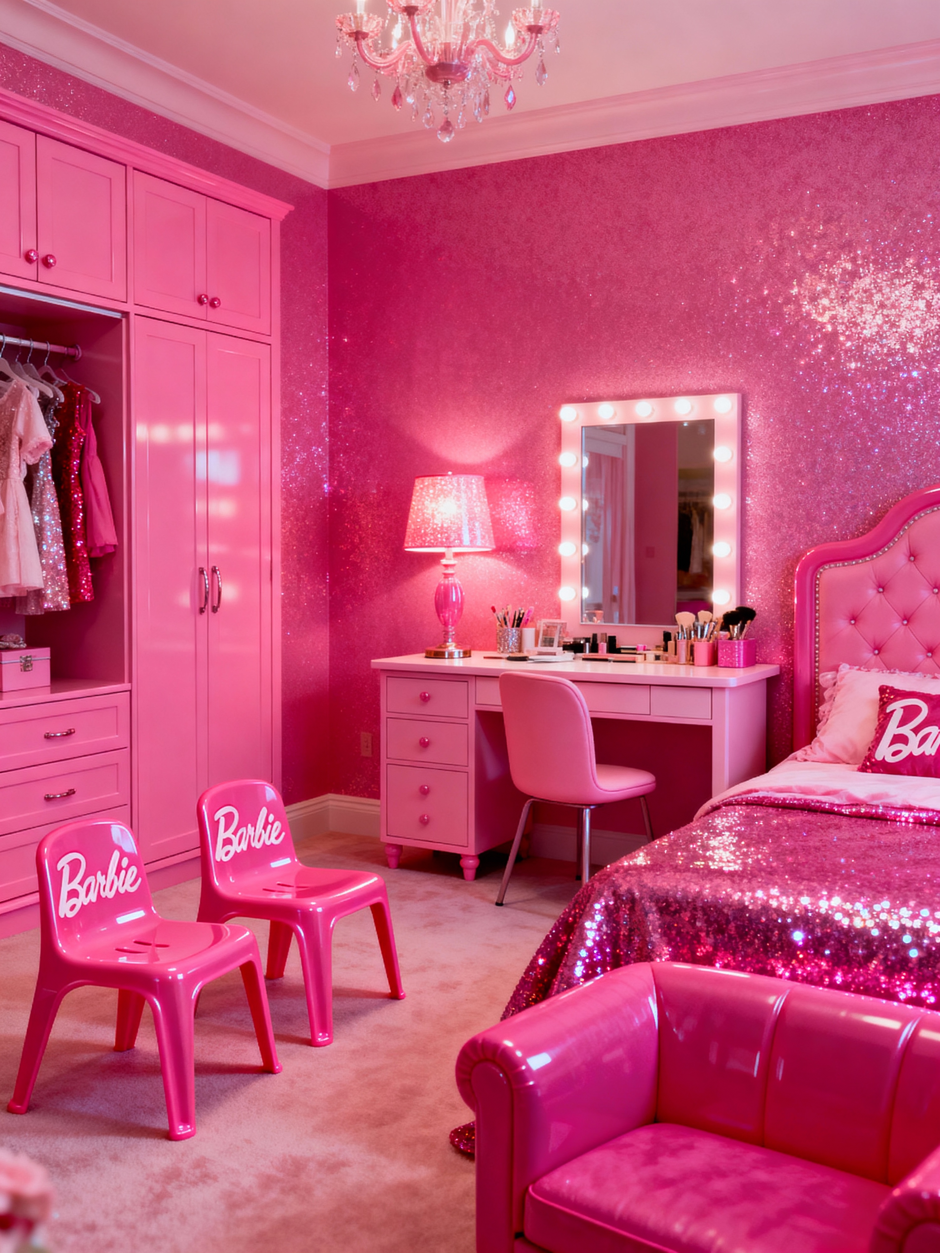 kids room with hot pink style with dresser closet and night light and kids desk and bedside table or night stand and mirror and accent chair and headboard and bed. . with barbie chairs and barbie bold rosy hues like fuchsia and magenta and barbie plastic interior and barbie sofa and barbie glitter and sparkle and barbie style interior and hot pink barbie colors and hot pink barbie walls