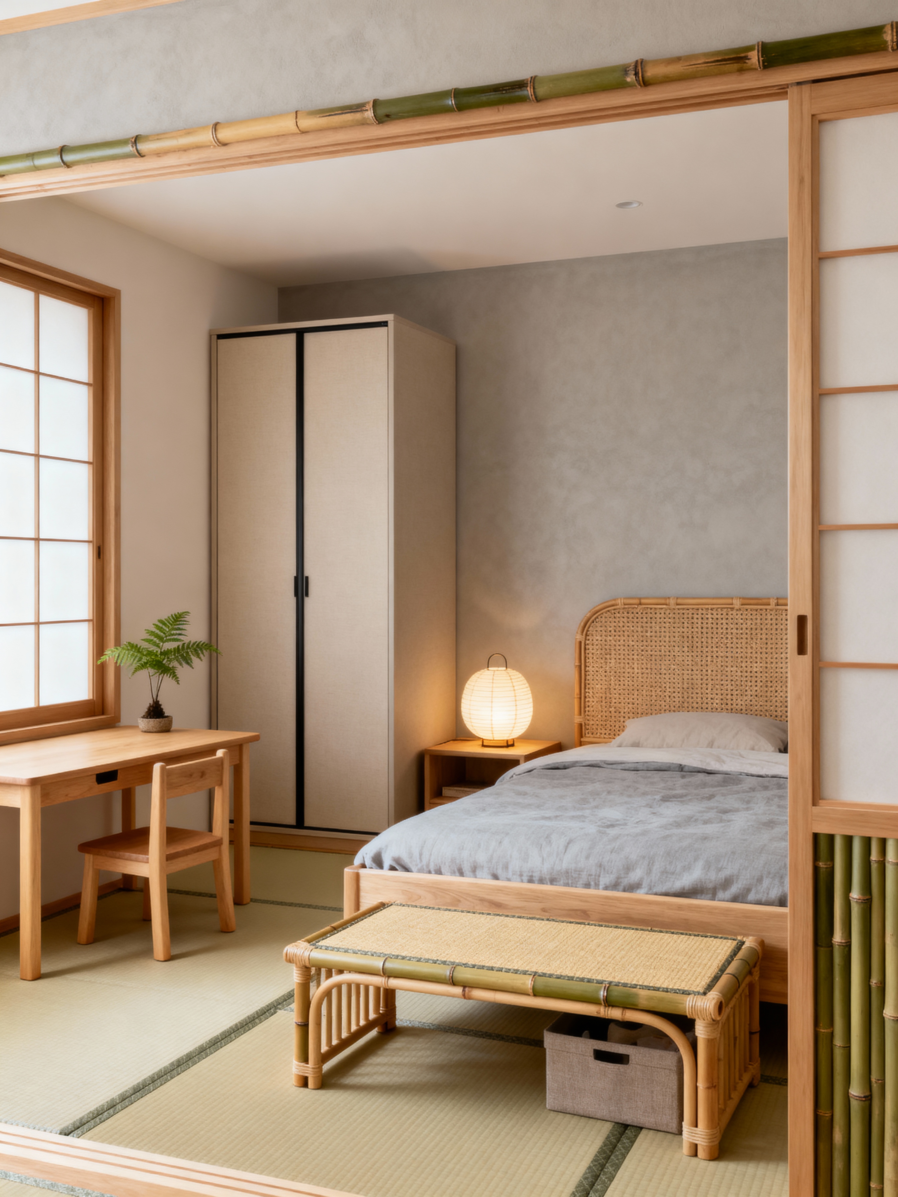 kids room with japanese design style with kids desk and bed and dresser closet and night light and plant and bedside table or night stand and headboard and storage bench or ottoman. . with tatami mats and natural materials and low furniture and minimalism and indoor plants and neutral colors and bamboo accents and sliding doors