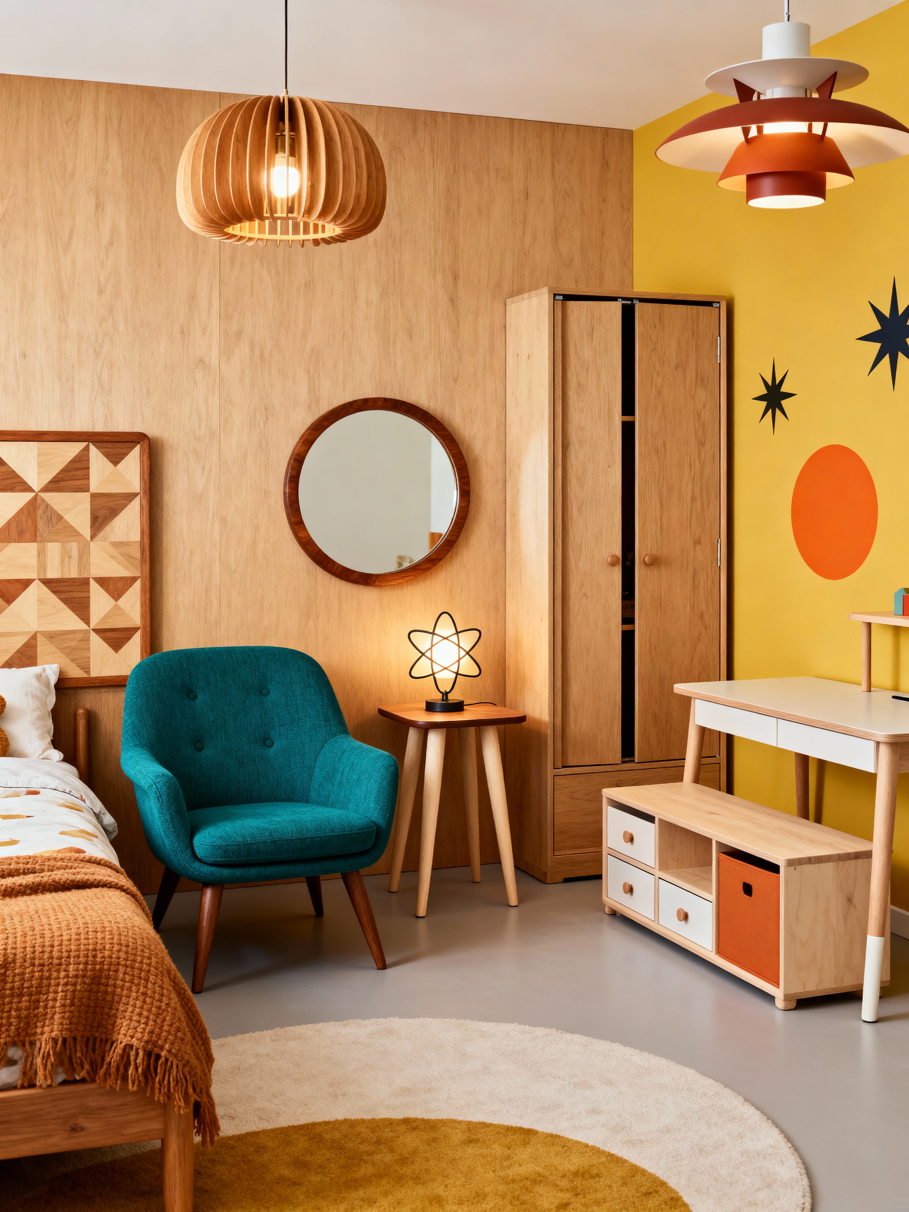 kids room with midcentury modern style with headboard and accent chair and bedside table or night stand and mirror and night light and storage bench or ottoman and kids desk and dresser closet. . with clean lines and function over form and nature indoors and vibrant colors and minimalist and natural and manmade materials and wood pendant light mid century modern chandelier and graphic shapes