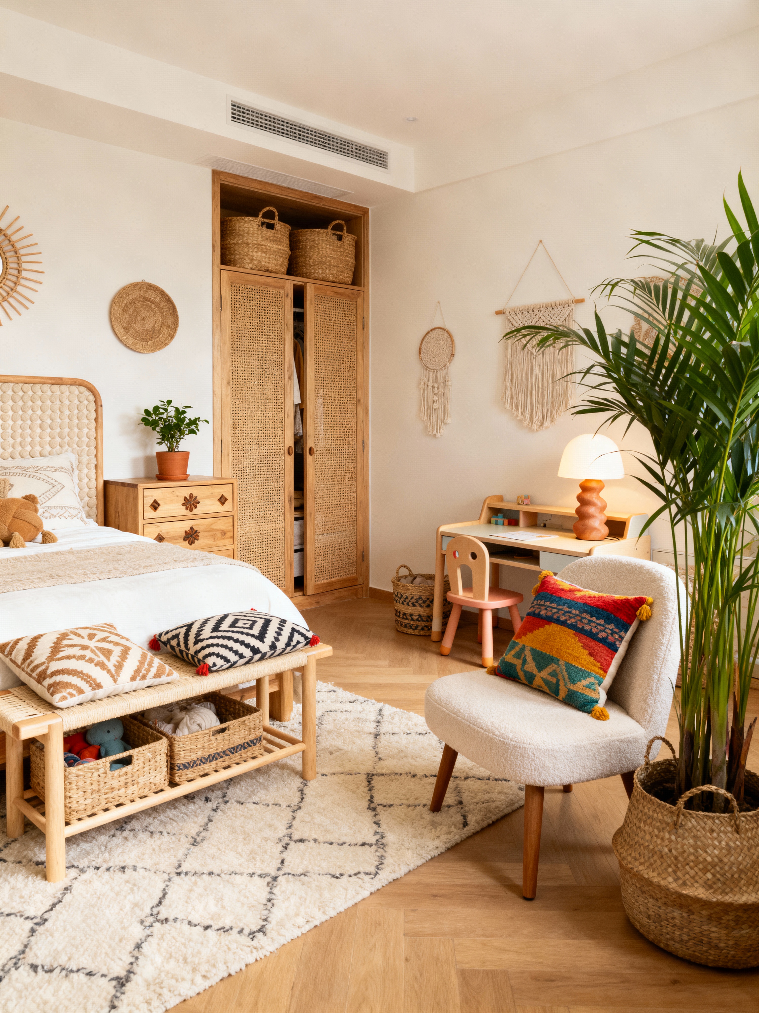kids room with modern boho style with dresser closet and bed and bedside table or night stand and storage bench or ottoman and plant and accent chair and kids desk and headboard. . with bohemian style and warm colors and neutral palette and handcrafted items and airy space and cozy feel and wood decor and unique finds